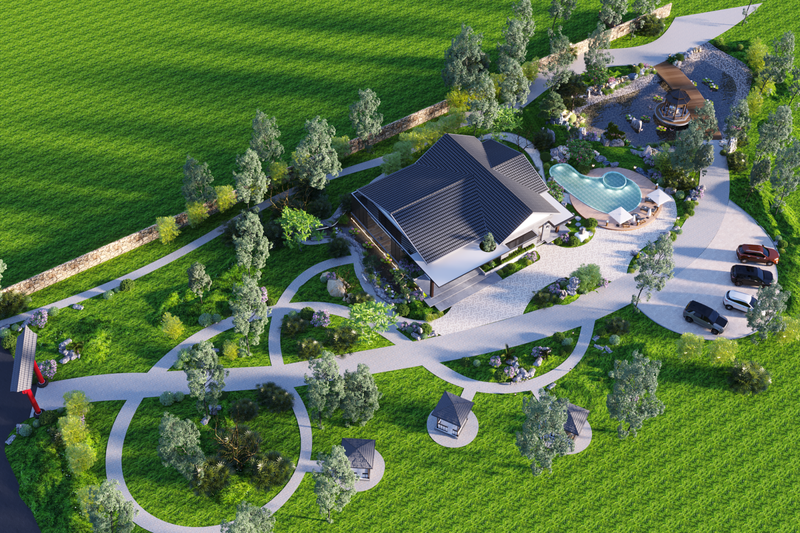 Ngôi nhà được phát triển trên ý tưởng của một “resort thu nhỏ” – nơi con người có thể rút mình ra khỏi nhịp sống vội vàng, để trở về với thiên nhiên, với chính mình. Cảm giác đầu tiên khi nhìn vào công trình này không phải là sự choáng ngợp, mà là sự dịu dàng. Từng đường nét, từng chi tiết đều nhường chỗ cho thiên nhiên lên tiếng.