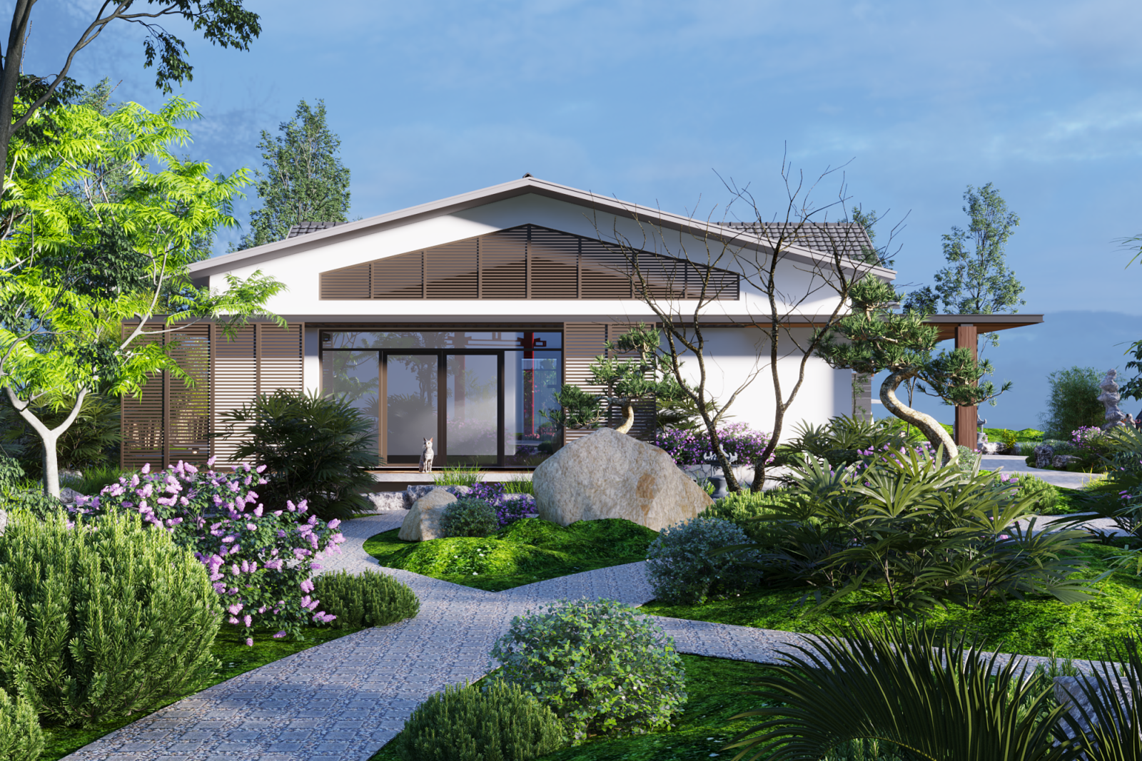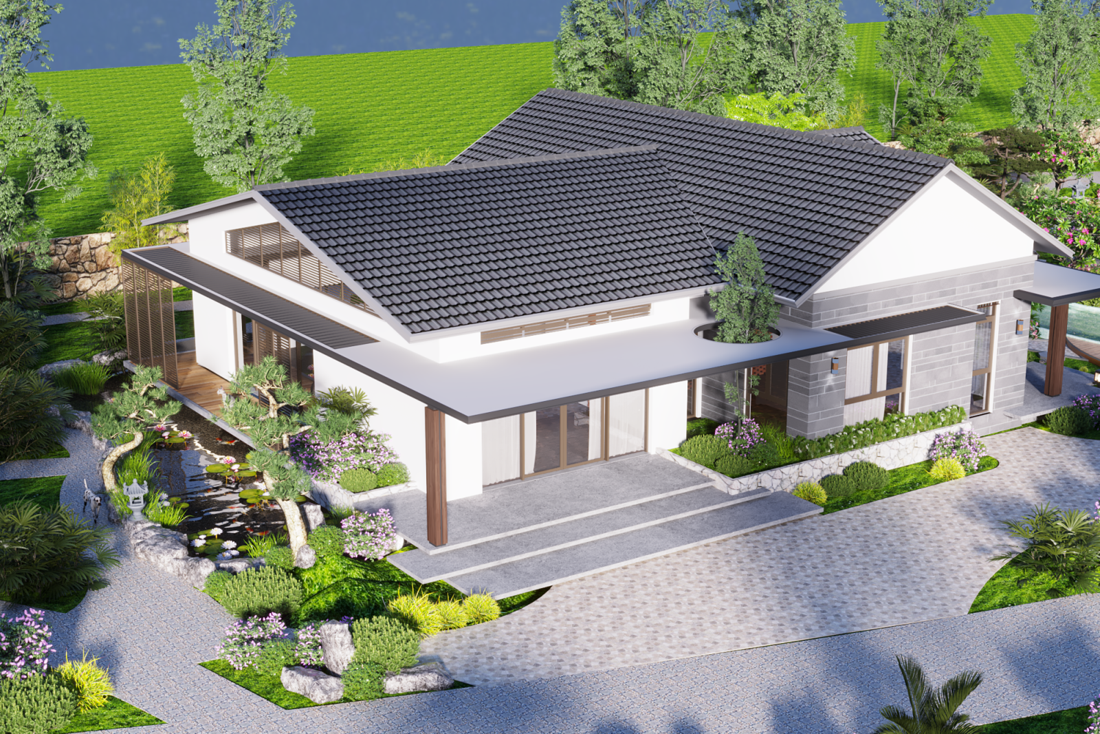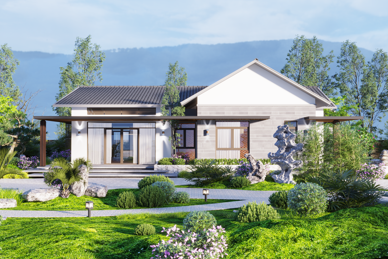 Phối cảnh tổng thể nổi bật với mái dốc truyền thống, ngói xám đậm, tường trắng thanh thoát, cùng các chi tiết gỗ và kính giúp ngôi nhà nhẹ nhàng, gần gũi nhưng vẫn mang dáng dấp hiện đại - mộc mạc nhưng không cũ kỹ.