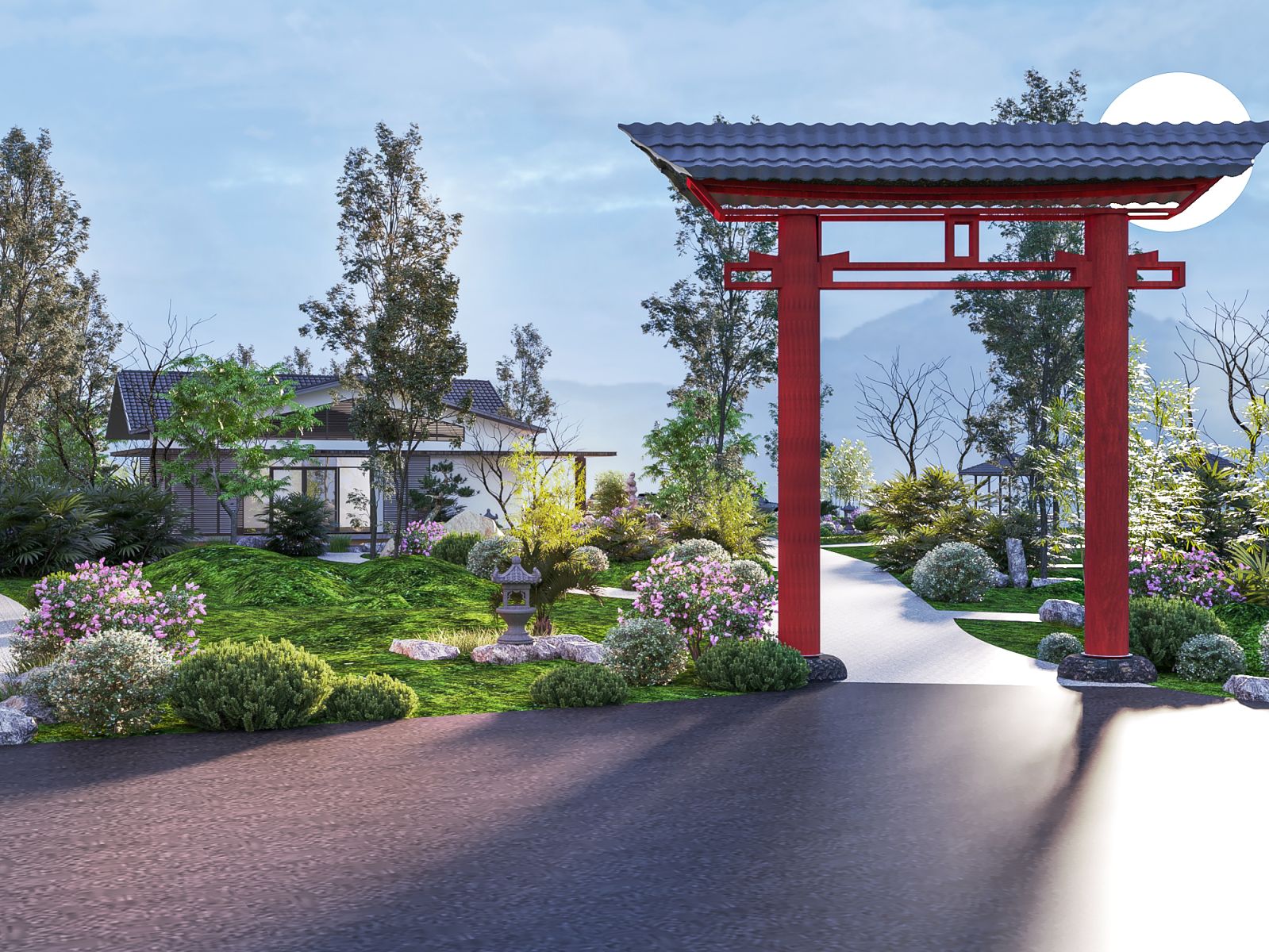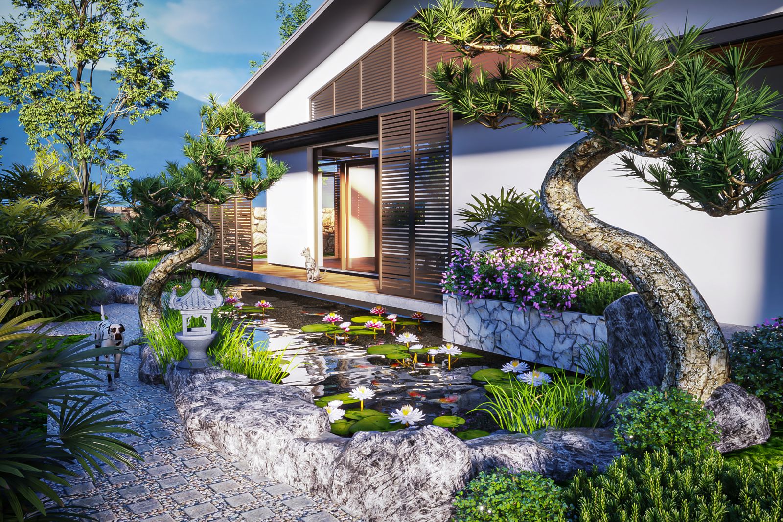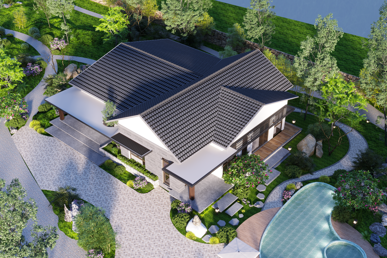 Phối cảnh tổng thể nổi bật với mái dốc truyền thống, ngói xám đậm, tường trắng thanh thoát, cùng các chi tiết gỗ và kính giúp ngôi nhà nhẹ nhàng, gần gũi nhưng vẫn mang dáng dấp hiện đại - mộc mạc nhưng không cũ kỹ.