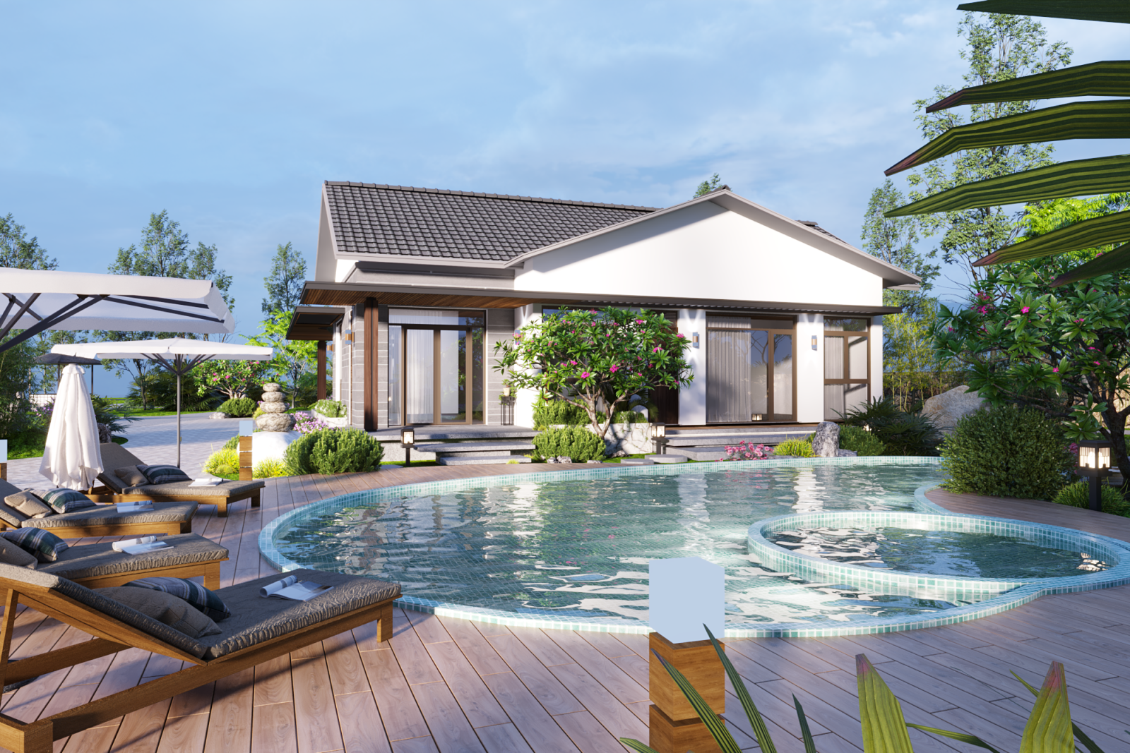 Khu vực sân sau với hồ bơi mềm mại, sàn gỗ và cây cối thấp tầng tạo nên một không gian thư giãn lý tưởng – vừa đủ riêng tư, vừa đong đầy sinh khí.