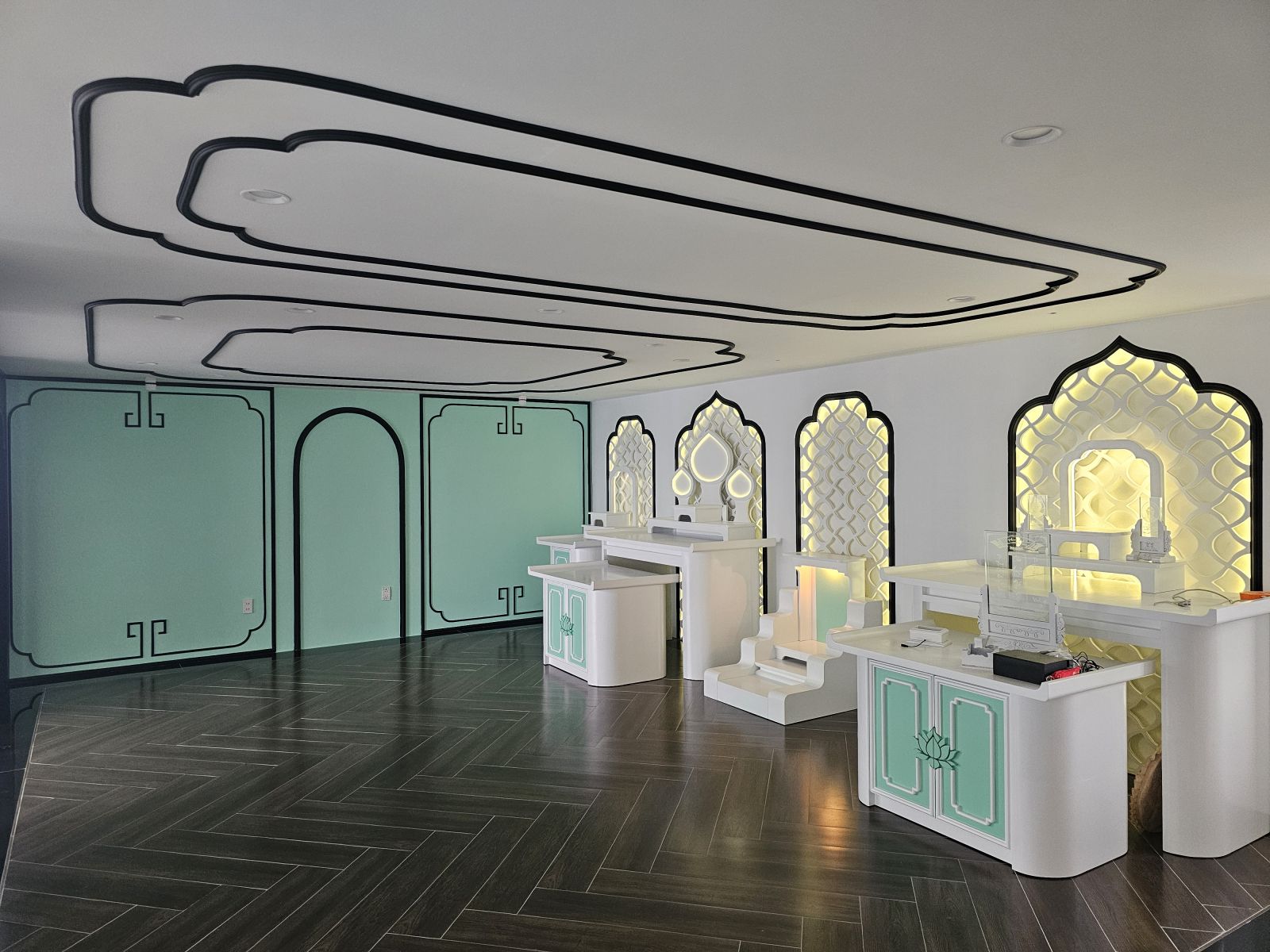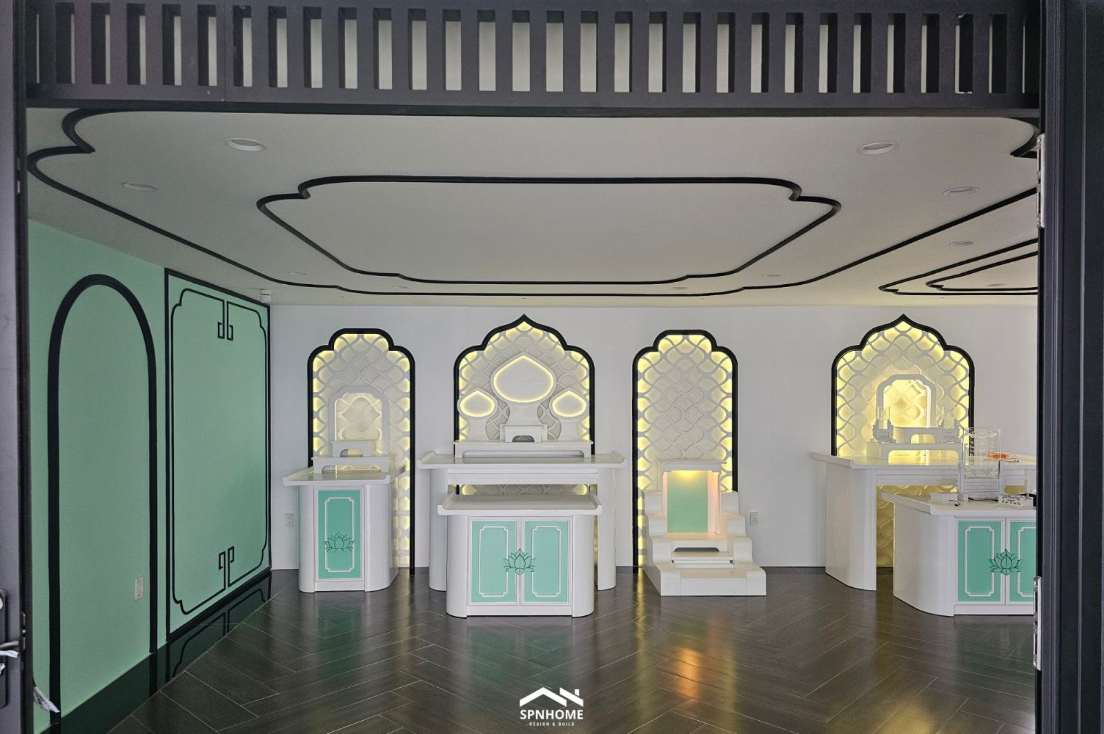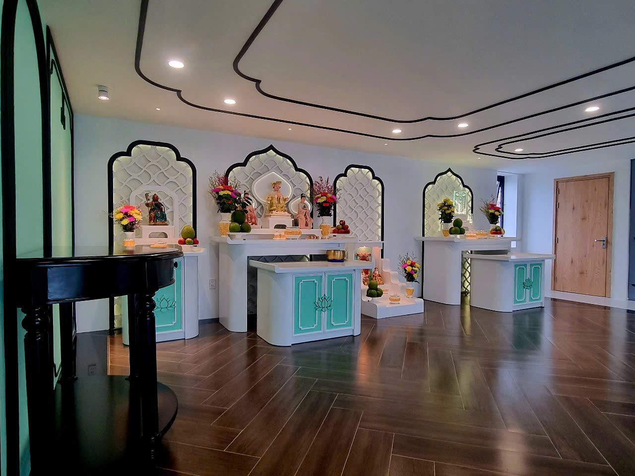 Trên tầng thượng, phòng thờ được thiết kế và thi công với điểm nhấn là các mảng khắc họa tiết Á Đông cách điệu, kết hợp ánh sáng hắt dịu mắt để giữ được sự trang nghiêm nhưng không nặng nề. Tông màu trắng - xanh phối viền đen cùng hệ nội thất gỗ trắng giúp không gian vừa thanh tịnh vừa hiện đại, phù hợp với vai trò là nơi kết nối tâm linh của cả gia đình.