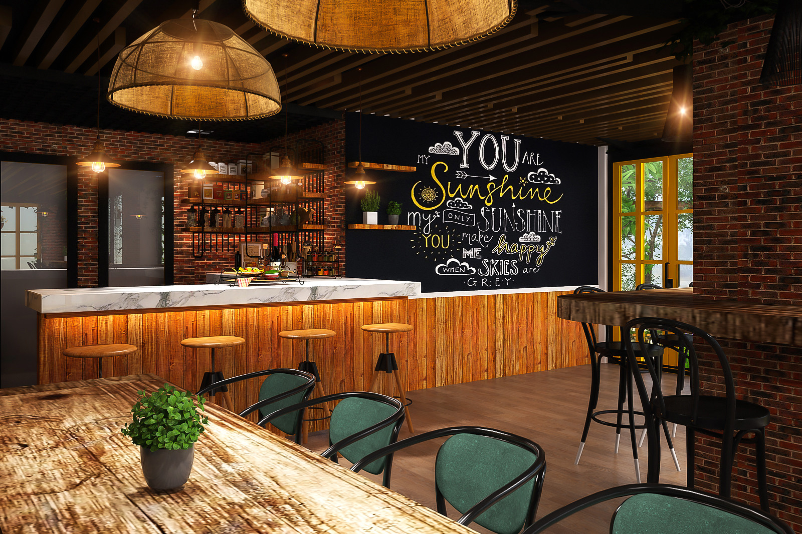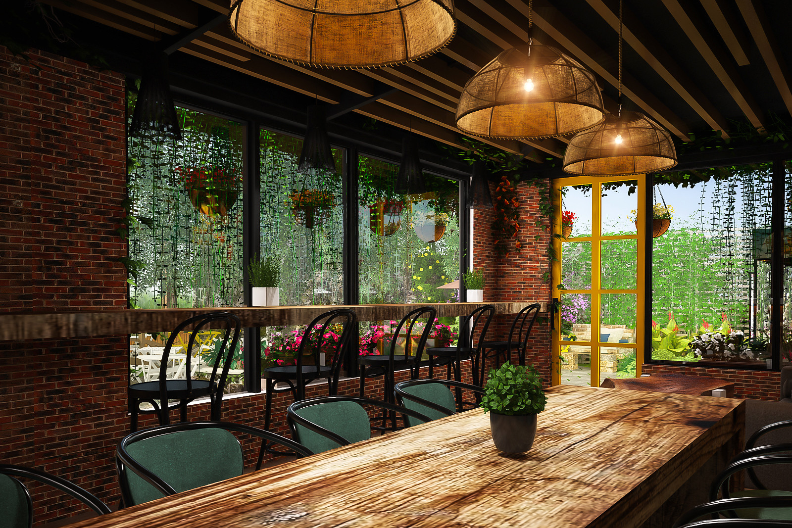 Bên trong quán, không gian mang hơi hướng Rustic với tường gạch thô, bàn gỗ tự nhiên và ánh sáng vàng ấm áp. Thiết kế nội thất tập trung vào cảm giác “thoải mái như ở nhà”, nơi khách có thể trò chuyện, làm việc, hay đơn giản chỉ là ngồi một mình nhìn ra vườn và thả lỏng tâm trí.