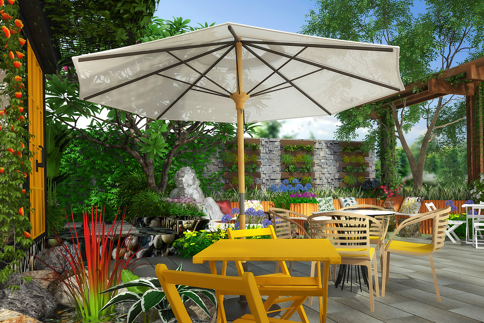 Bàn ghế ngoài trời được lựa chọn với gam màu nhẹ, kiểu dáng đơn giản nhưng tinh tế, phù hợp với tổng thể xanh mát và gần gũi. Mỗi góc nhỏ trong khuôn viên đều mang một vẻ đẹp riêng – đôi khi là chiếc scooter cổ điển dựng cạnh mảng tường gạch đỏ, đôi khi là bộ bàn ghế vàng nổi bật giữa vườn hoa, hay một góc ngồi riêng tư bên hàng dây leo rủ mềm.