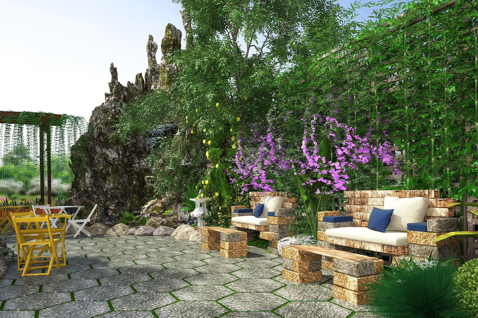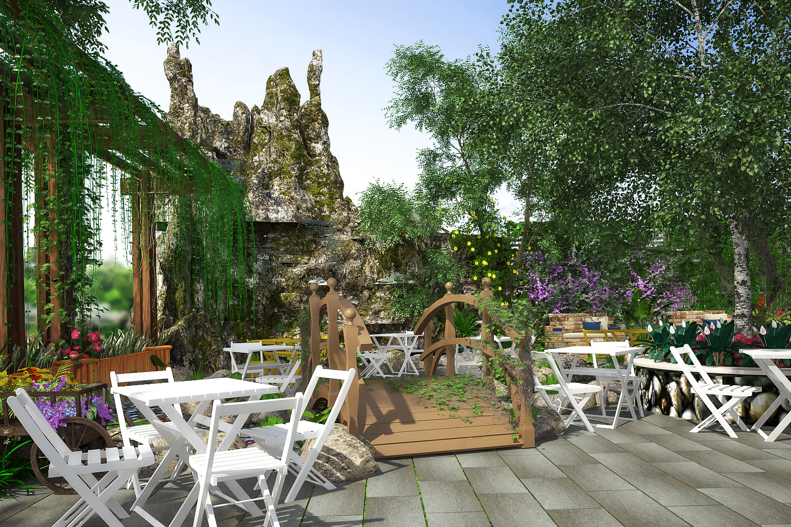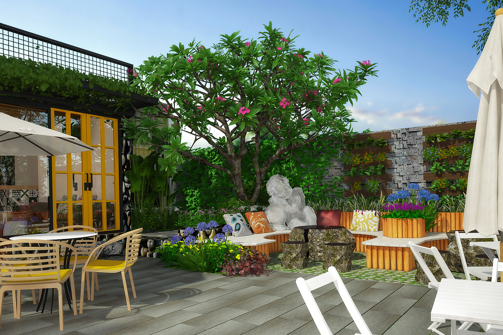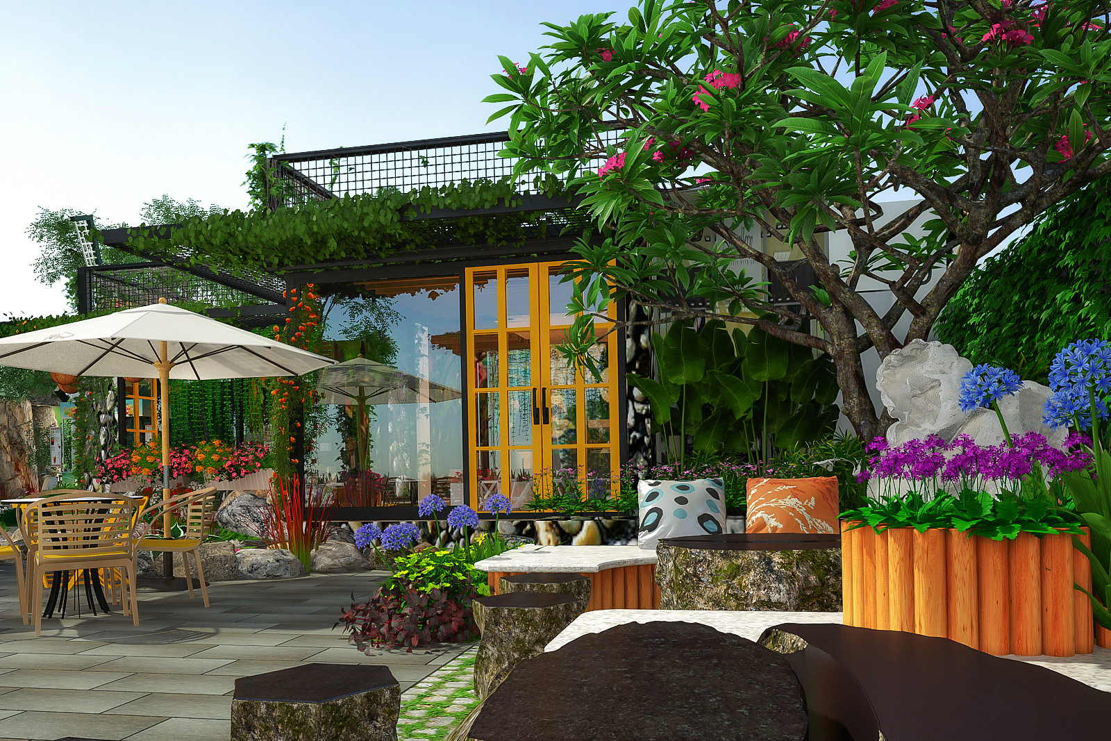 Ngay từ ý tưởng ban đầu, đội ngũ thiết kế của SPNhome đã hướng đến một không gian mở, tận dụng tối đa ánh sáng tự nhiên, gió trời và sắc xanh cây cỏ. Khuôn viên quán được bố trí khéo léo với những lối đi lát đá xen lẫn thảm cỏ, kết hợp cùng nhiều loại cây bụi, hoa và tiểu cảnh đá – tất cả tạo nên một bức tranh hài hòa, sống động và đầy sức sống.