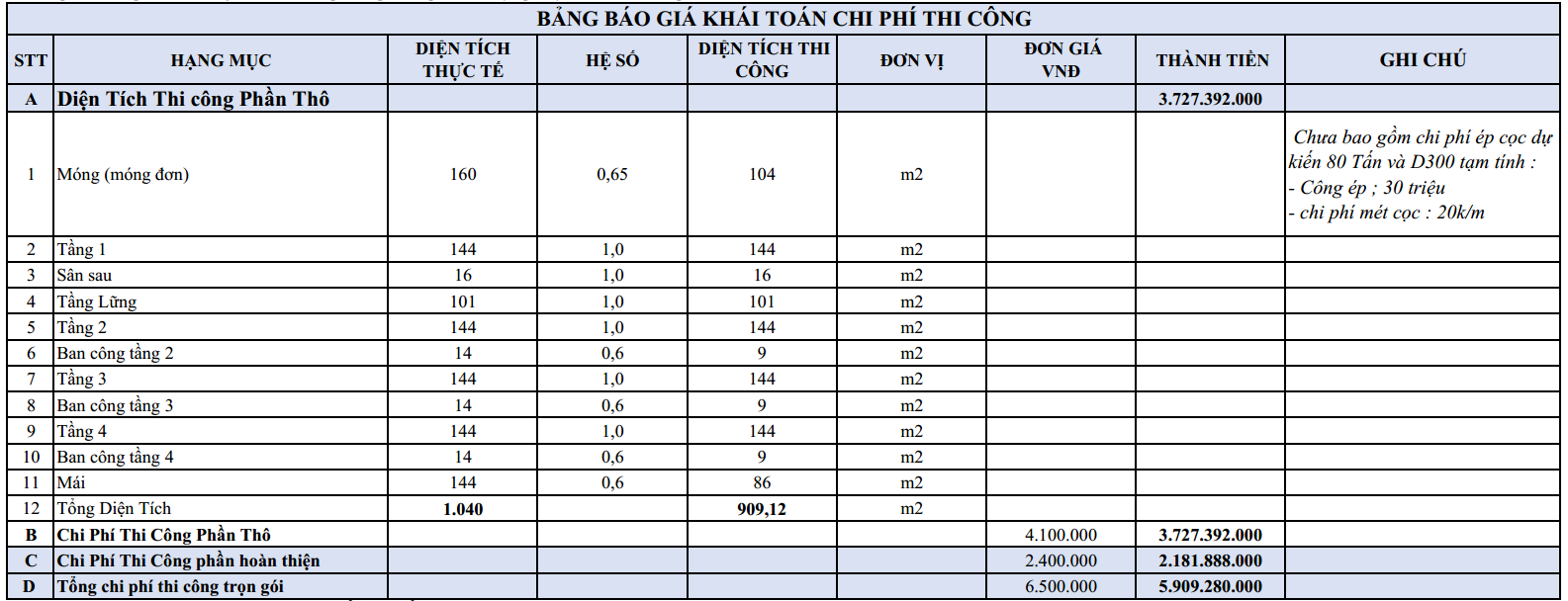 Ví dụ: Bạn có mảnh đất 160m2, xây trệt 5 Tầng, thì tổng diện tích xây dựng là 1040m2, cộng thêm phần móng cọc 65%, mái btct 50% , Chi phí không bao gồm ép cọc bê tông ( vì mỗi địa chất khác nhau nên chi phí cọc khác nhau và được tính theo khối lượng ép thực tế )