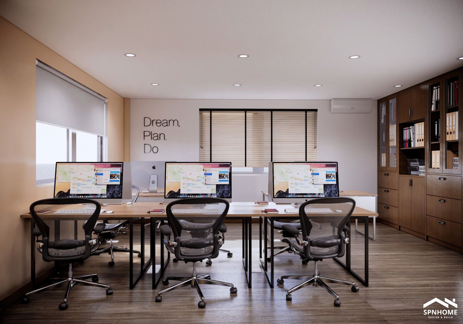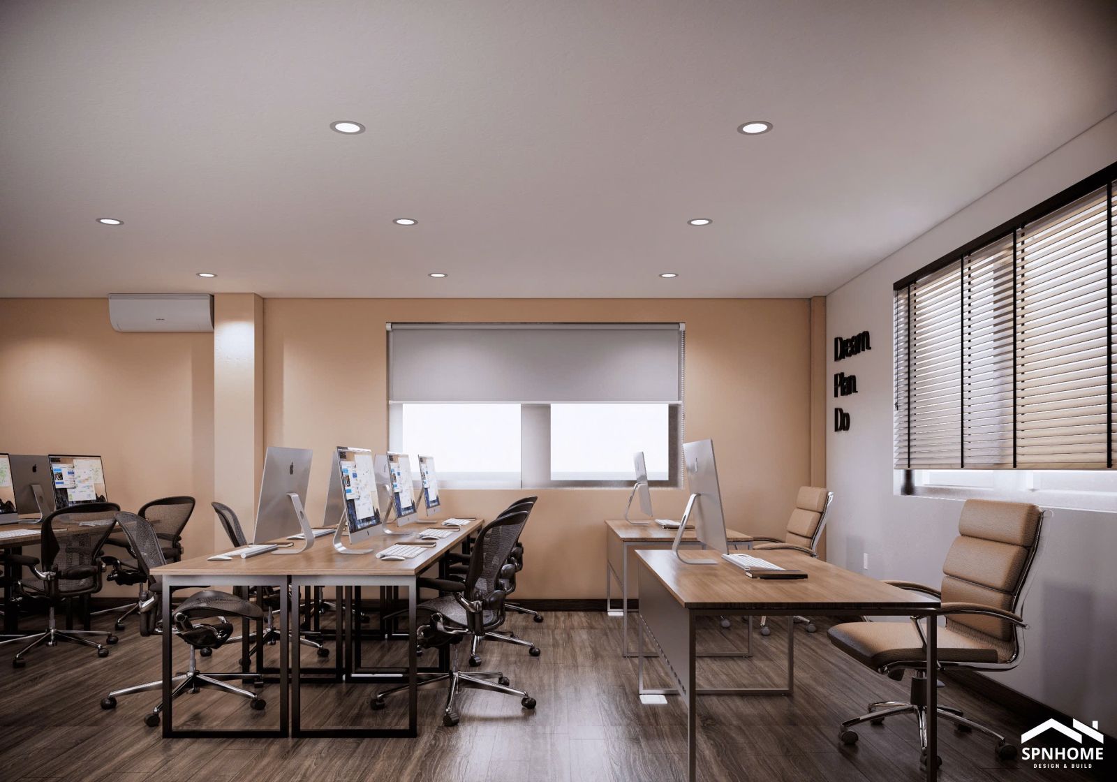 Các cụm bàn 4–6 chỗ được sắp xếp khoa học, hướng ra cửa sổ lớn để đón ánh sáng tự nhiên. Màn hình iMac đồng bộ mang đến sự tiện lợi, trong khi các slogan như “Dream. Plan. Do” hay “Teamwork” trở thành điểm nhấn tinh thần, khơi gợi động lực làm việc.