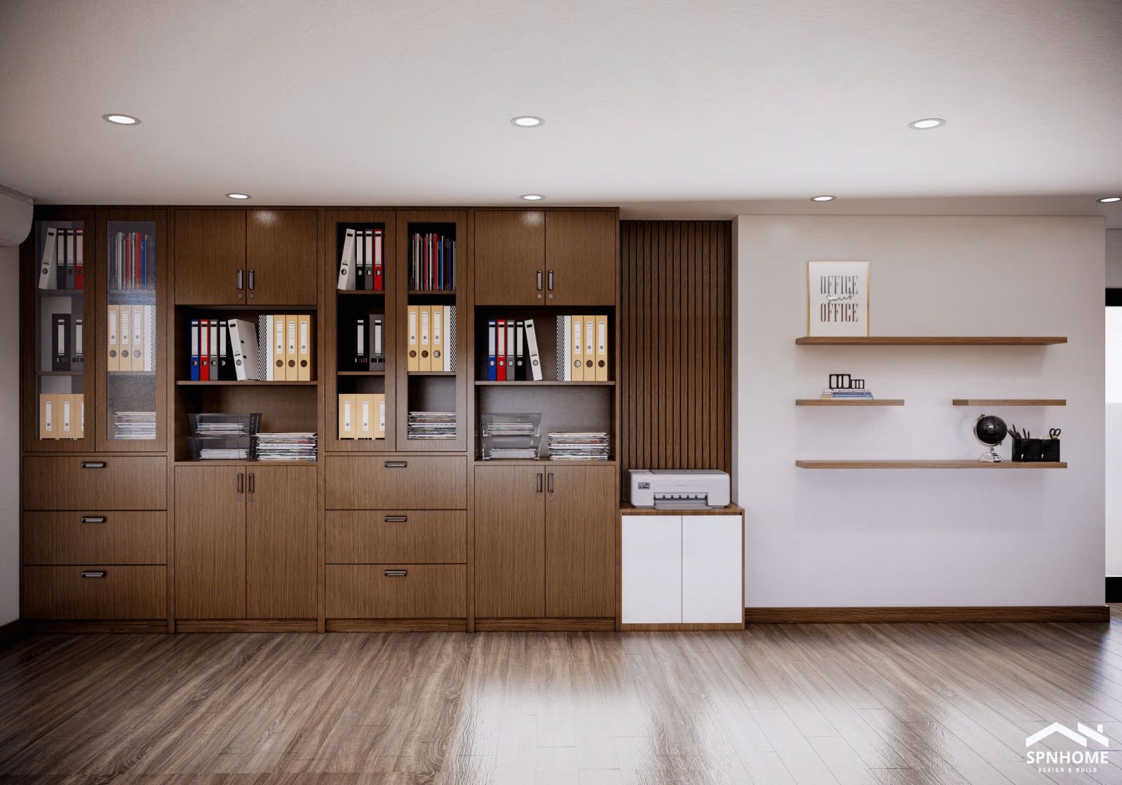 Ngay khi bước vào, ấn tượng đầu tiên là sự ngăn nắp. Hệ tủ gỗ kịch trần kết hợp kệ mở giúp tối ưu không gian, giữ cho văn phòng luôn gọn gàng. Tài liệu, hồ sơ và thiết bị văn phòng được bố trí hợp lý, hỗ trợ tối đa cho công việc hàng ngày.