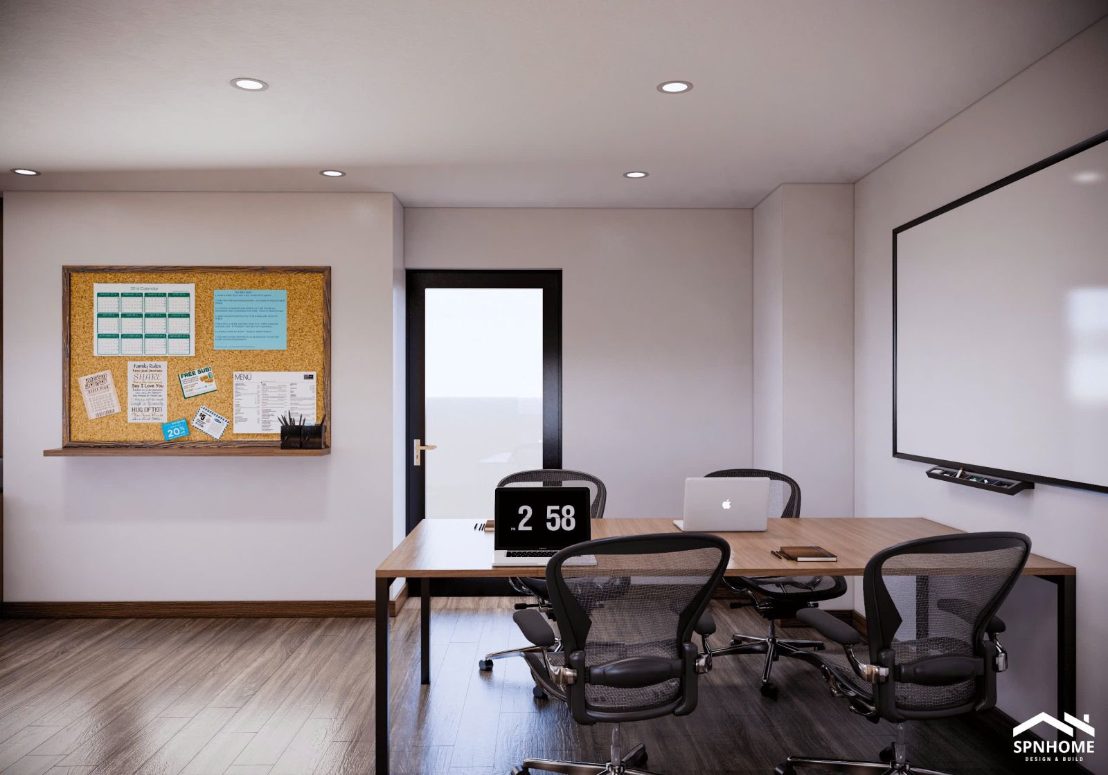 Thiết kế hiện đại với bàn dài trung tâm, ghế xoay công thái học và bảng trắng lớn. Đây không chỉ là nơi bàn bạc công việc, mà còn là không gian để thảo luận chiến lược, đưa ra quyết định và trình bày những ý tưởng mới mẻ.