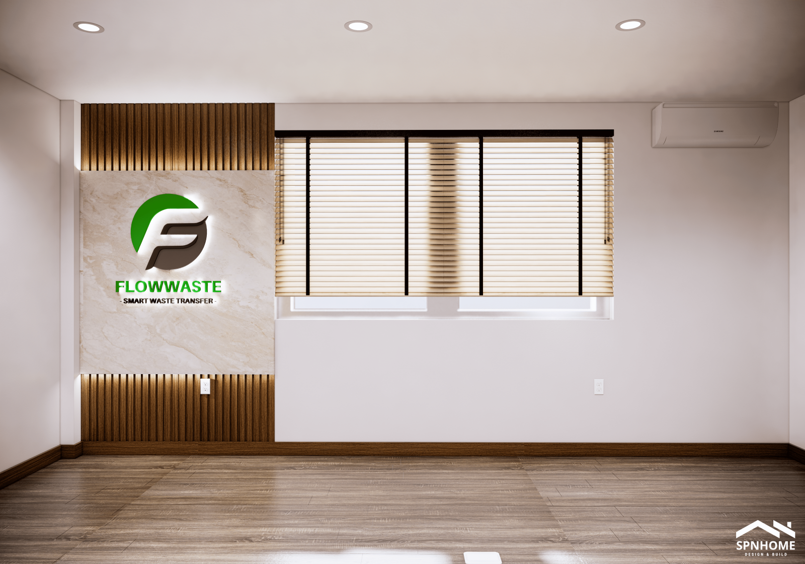 Ngay lối vào, vách logo Flowwaste nổi bật với đá marble sáng và chi tiết gỗ ấm, vừa sang trọng vừa chuyên nghiệp – trở thành “góc chào đón” đầy ấn tượng cho toàn văn phòng.