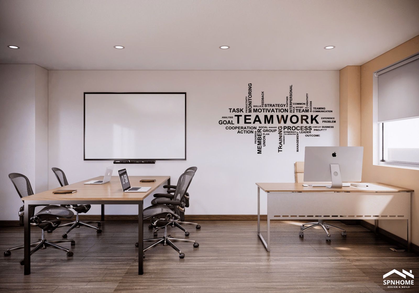 Đi sâu về cuối dãy, không gian teamwork với iMac hiện đại mở ra như một khu làm việc chung đầy cảm hứng. Hai bàn dài bố trí khoa học, ghế xoay linh hoạt cùng bảng trắng lớn giúp nhân sự dễ dàng họp nhanh, brainstorm ý tưởng và cộng tác. Vị trí cuối dãy tạo cảm giác riêng tư, tập trung nhưng vẫn kết nối, nâng cao hiệu suất làm việc cho cả đội.