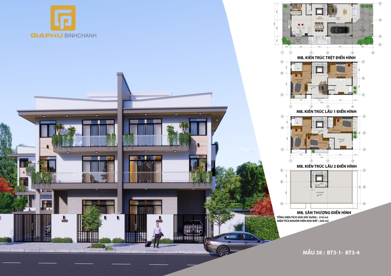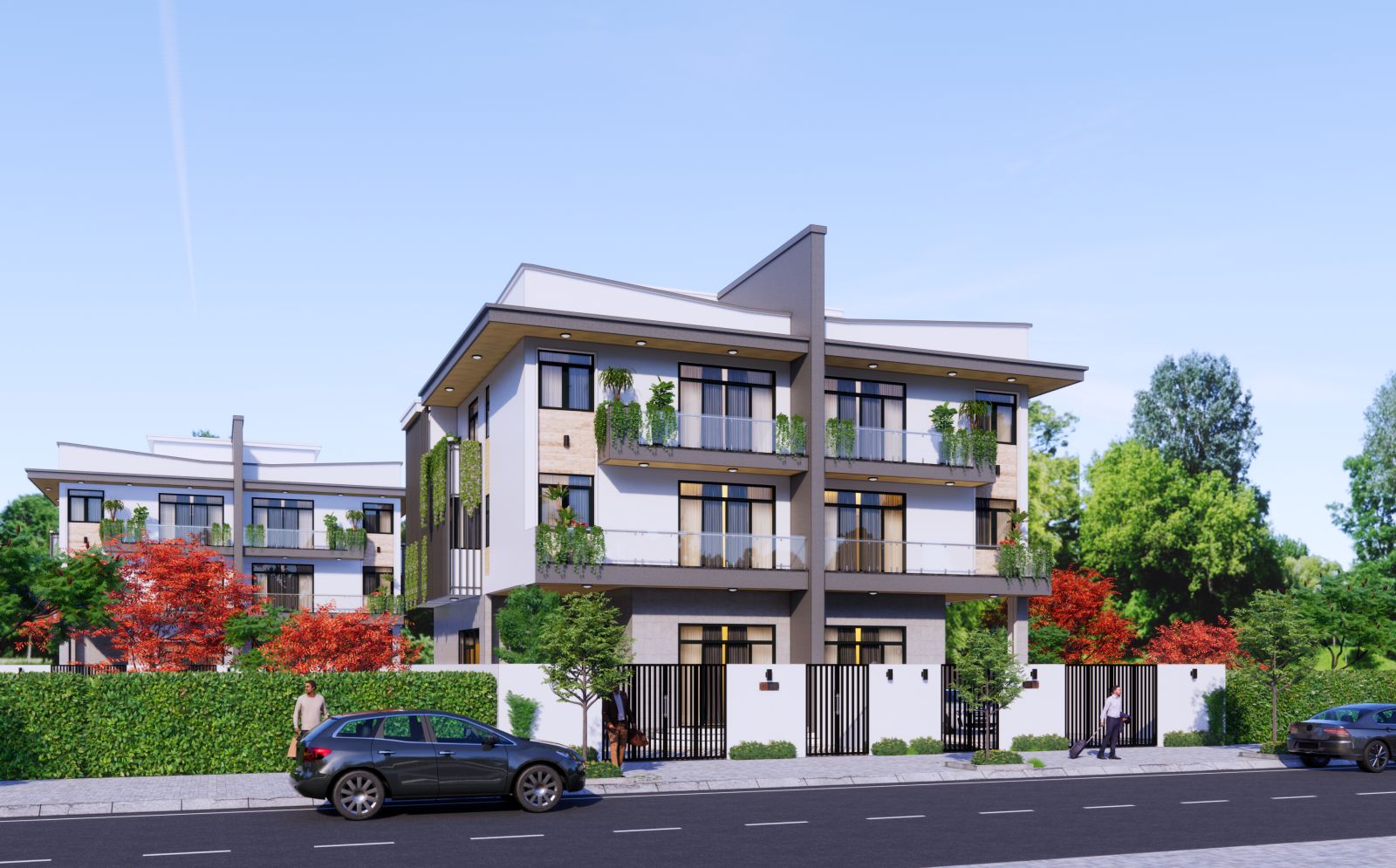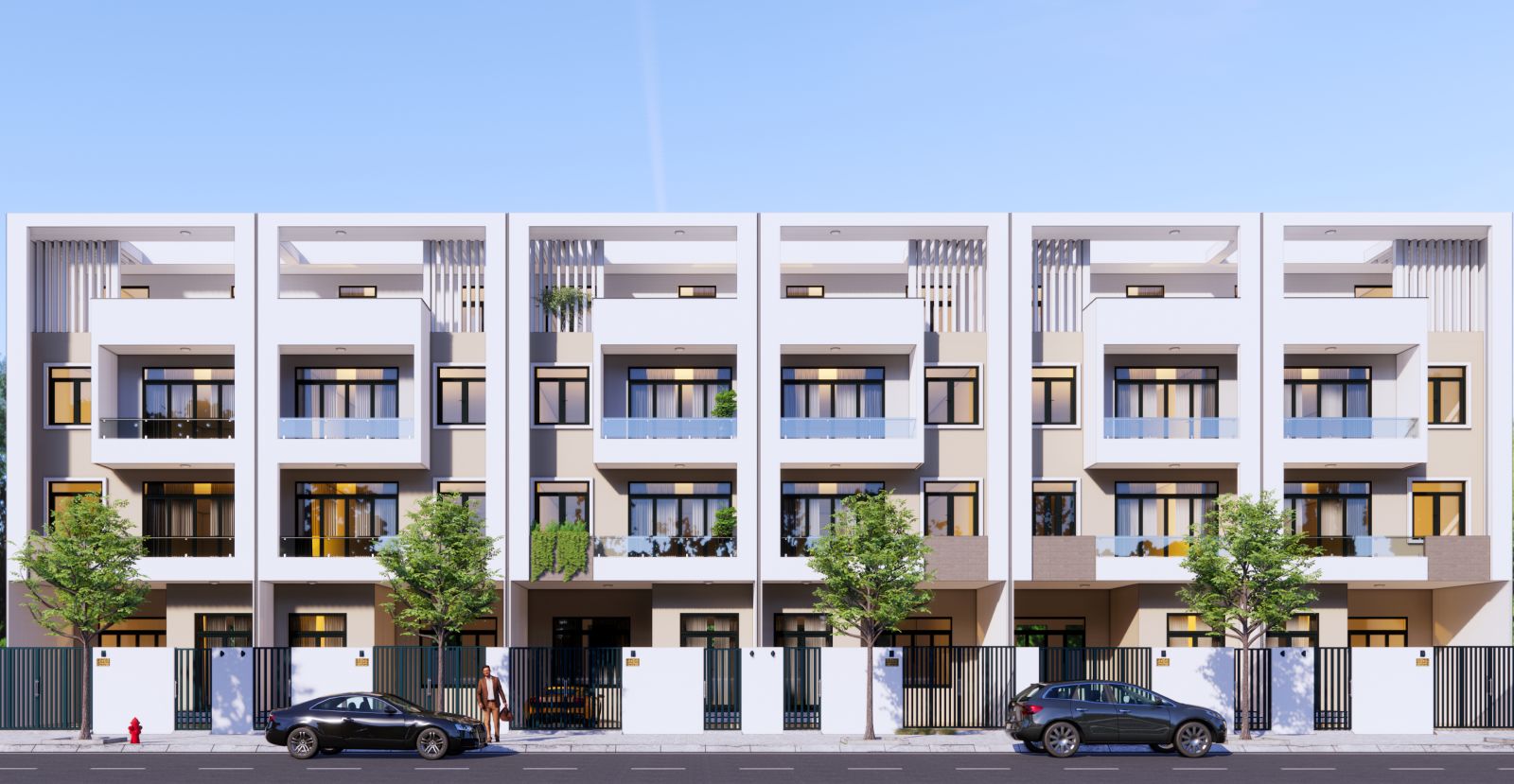 Mỗi căn nhà trong dự án được bố trí 1 trệt, 2 lầu và sân thượng, đảm bảo đầy đủ không gian sinh hoạt, riêng tư và mở rộng theo nhu cầu sử dụng thực tế. Mặt tiền được thiết kế tối giản với tỷ lệ hình khối rõ ràng, sử dụng tông màu sáng – trung tính để phù hợp với nhiều phong cách nội thất.