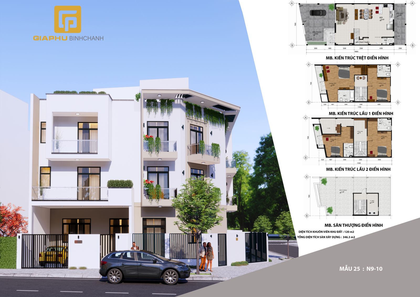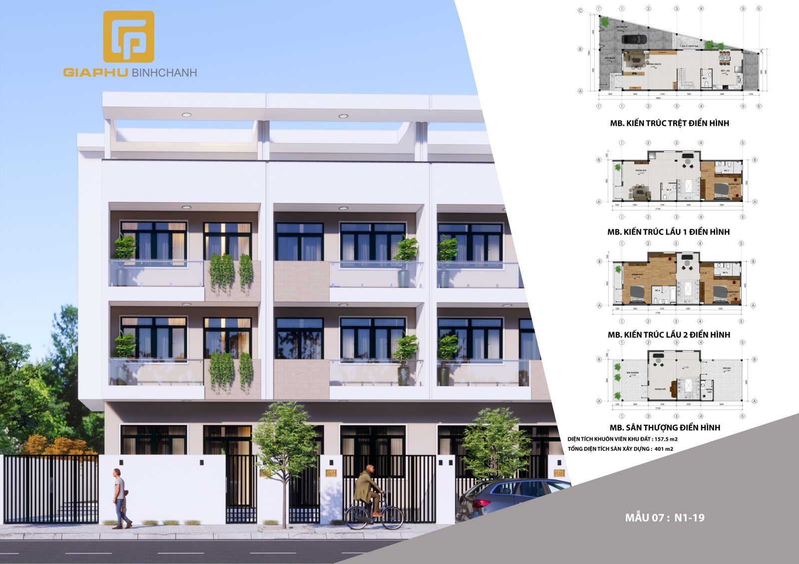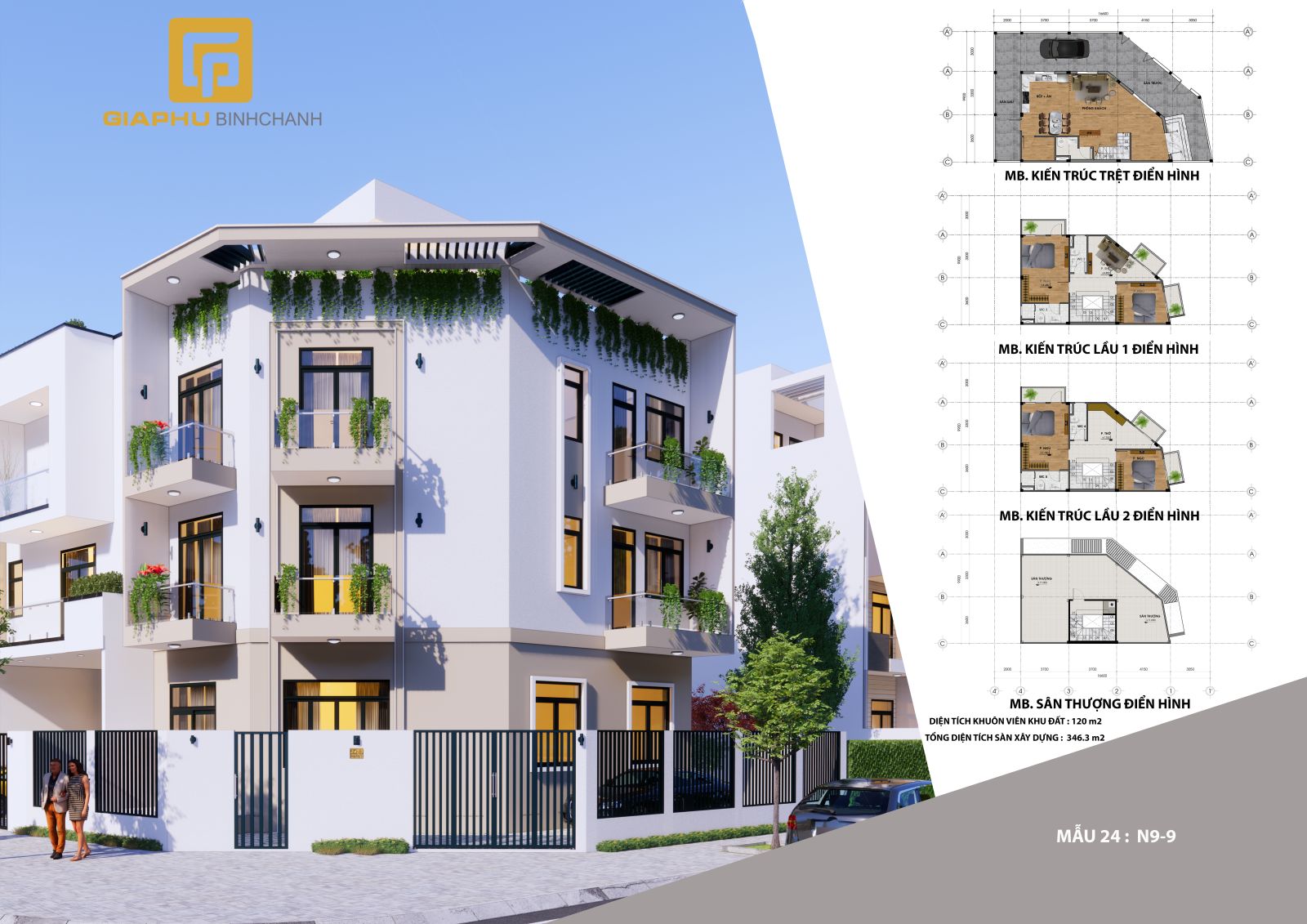 Mỗi căn nhà trong dự án được bố trí 1 trệt, 2 lầu và sân thượng, đảm bảo đầy đủ không gian sinh hoạt, riêng tư và mở rộng theo nhu cầu sử dụng thực tế. Mặt tiền được thiết kế tối giản với tỷ lệ hình khối rõ ràng, sử dụng tông màu sáng – trung tính để phù hợp với nhiều phong cách nội thất.