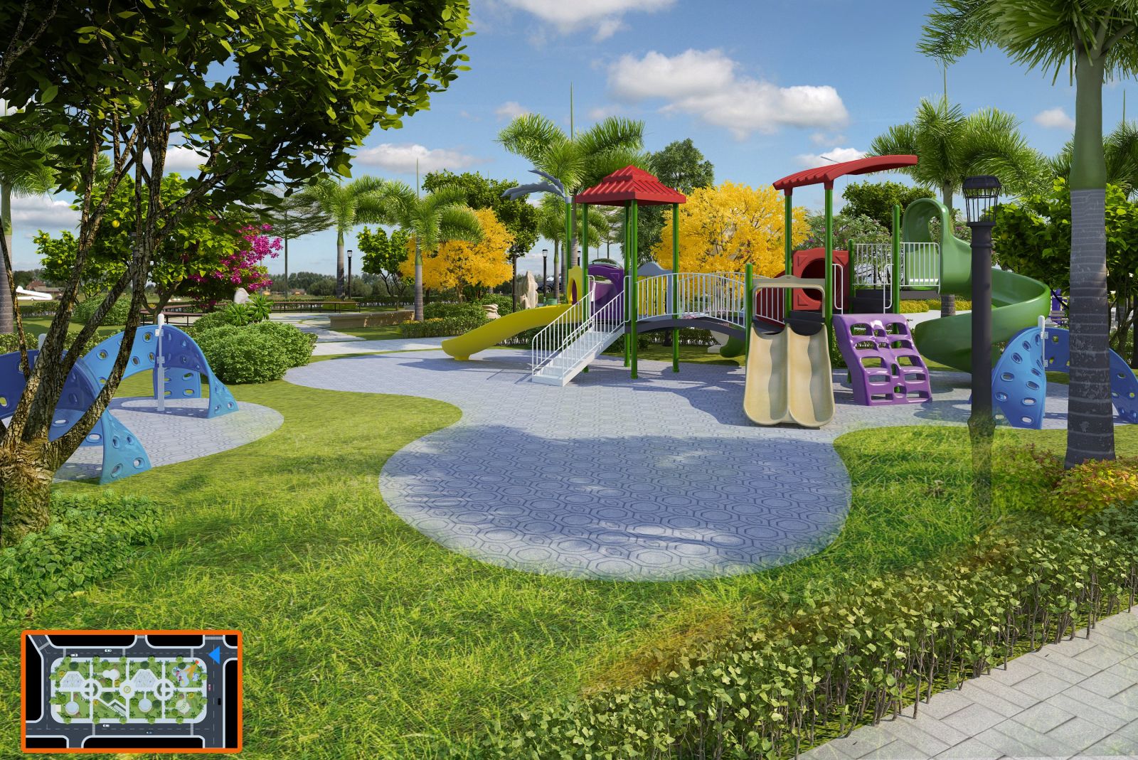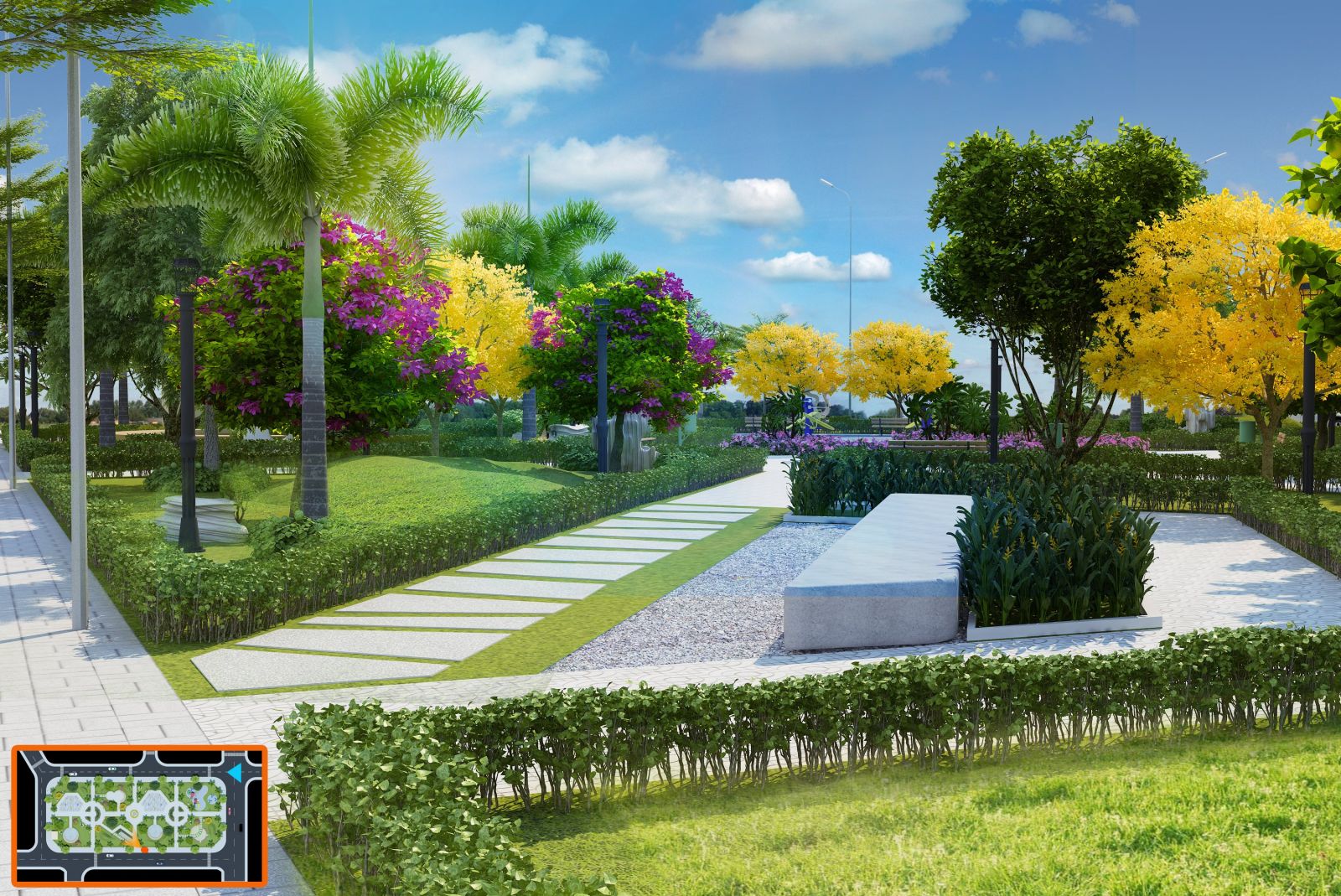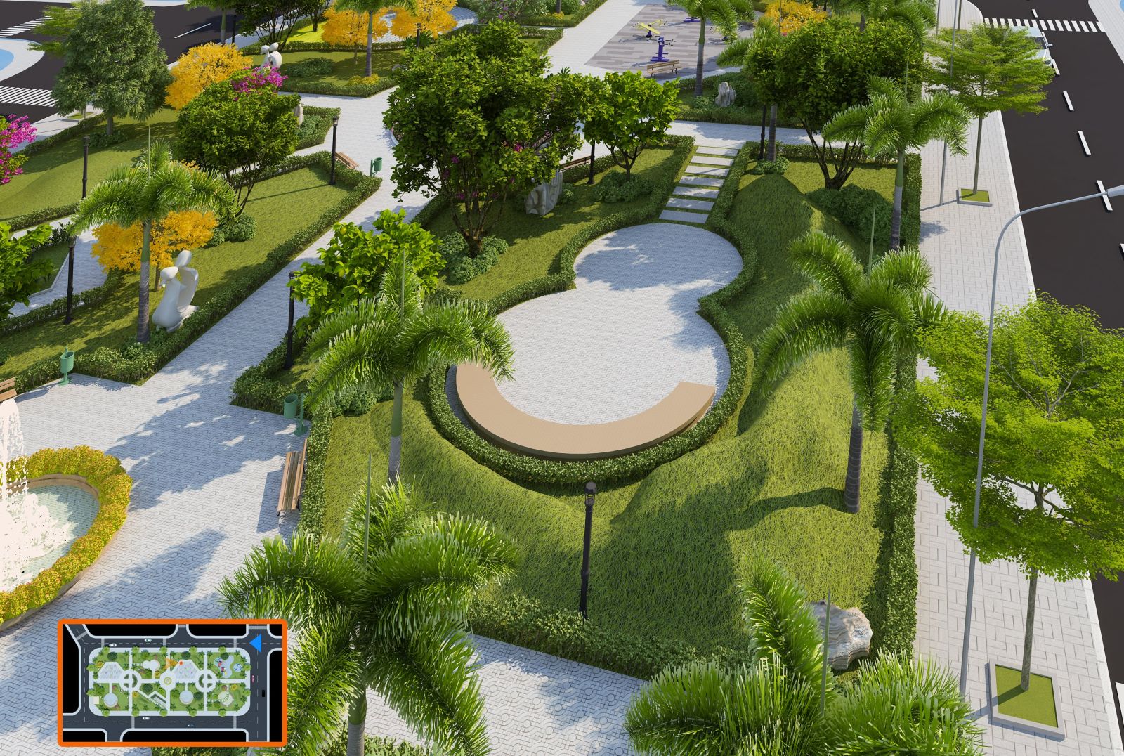 Trong tổng thể quy hoạch, công viên nội khu đóng vai trò như một lõi sinh thái – vừa là điểm nhấn cảnh quan, vừa là không gian cộng đồng cho cư dân. Diện tích công viên được bố trí liền kề các trục giao thông chính và cụm nhà ở, đảm bảo khả năng tiếp cận thuận tiện từ mọi hướng.