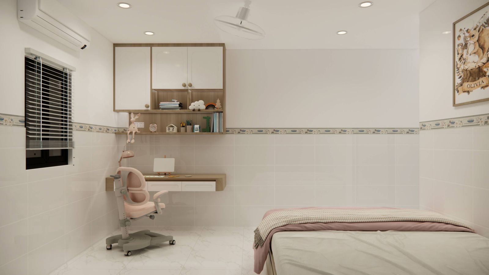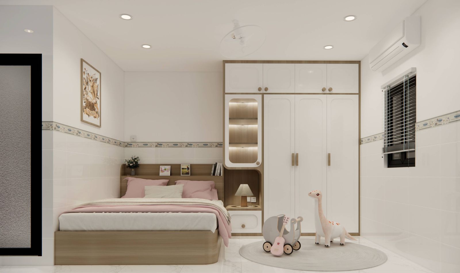 Phòng bé được thiết kế đơn giản, gọn gàng, ưu tiên không gian sử dụng và di chuyển. Nội thất gỗ sáng kết hợp màu sắc trung tính giúp căn phòng vừa dễ thương, vừa phù hợp để bé lớn lên theo thời gian mà không bị lỗi phong cách.