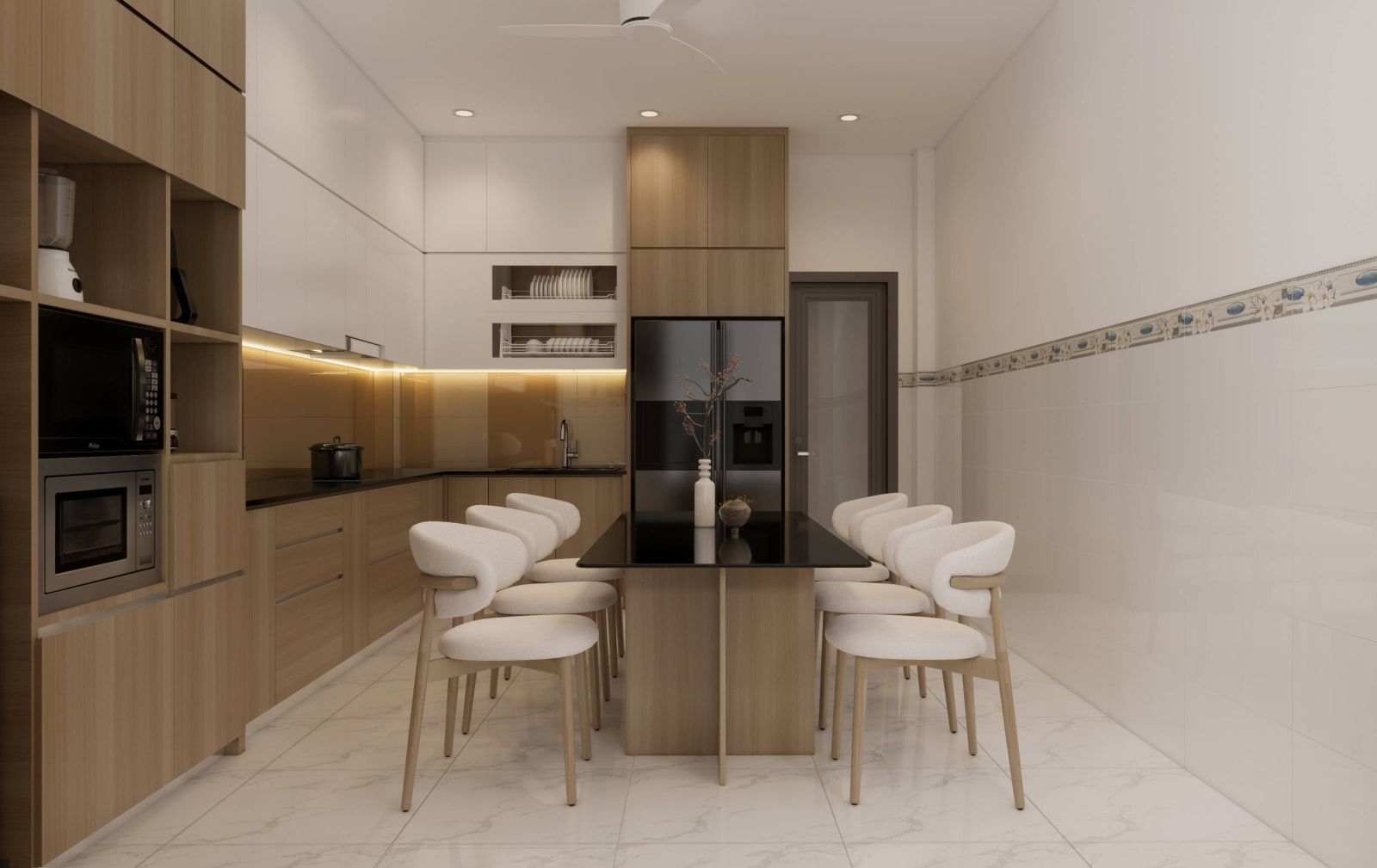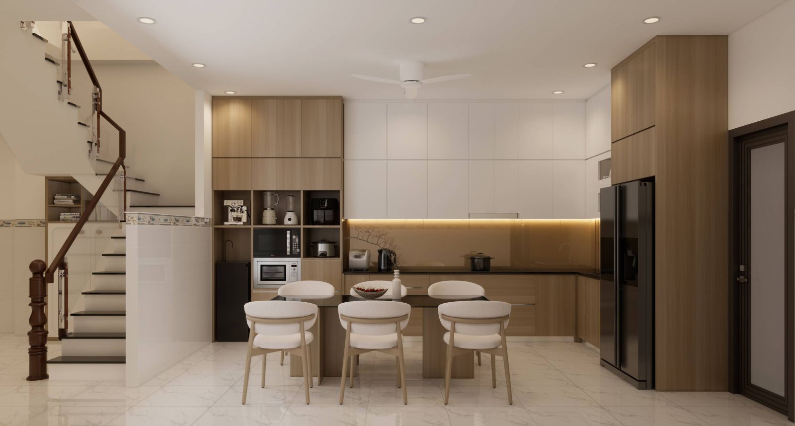 Khu bếp nằm phía trong, được bố trí gọn sát tường, sử dụng hệ tủ bếp gỗ cao kịch trần. Thiết kế tập trung vào công năng, tối ưu lưu trữ, giúp khu vực bếp luôn sạch sẽ và ngăn nắp. Ánh sáng kết hợp cùng màu gỗ tạo cảm giác ấm cúng cho những bữa ăn gia đình.