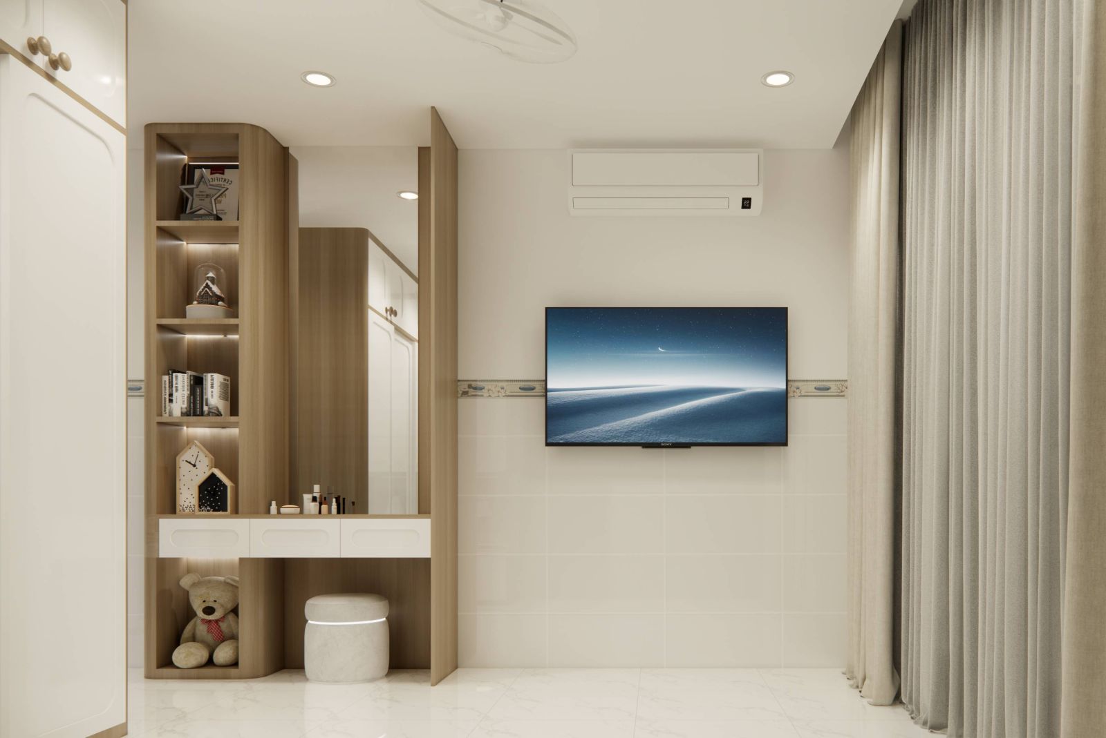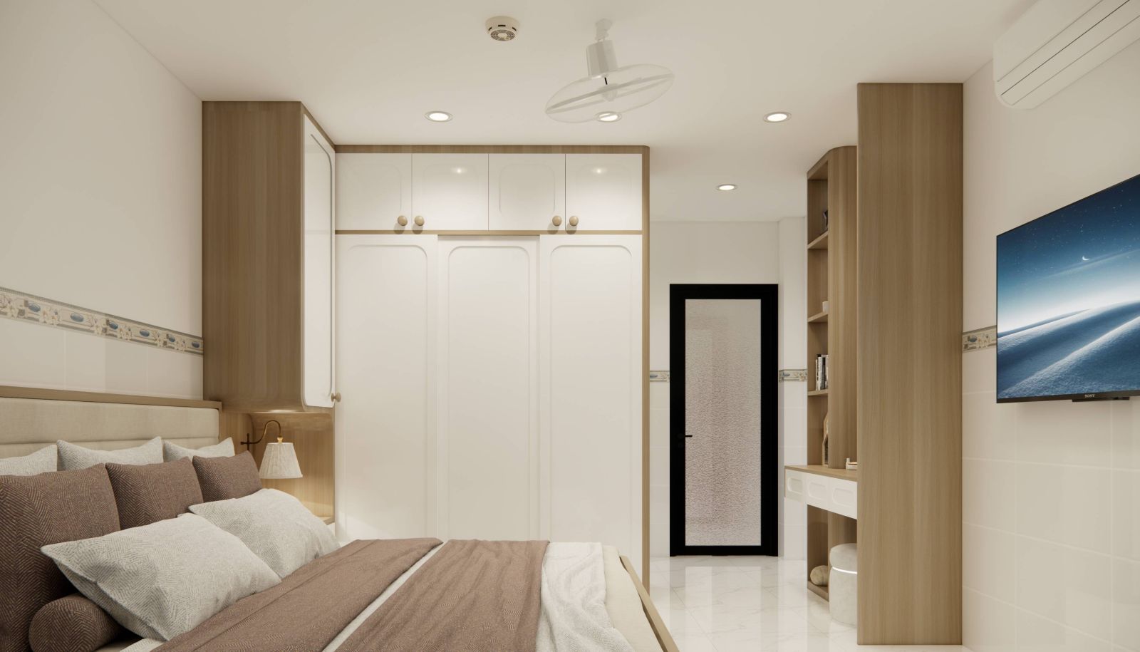 Phòng ngủ master mang phong cách nhẹ nhàng – ấm – riêng tư. Nội thất gỗ được thiết kế đồng bộ từ giường ngủ, tủ quần áo đến kệ trang trí. Không gian được cân đối giữa ánh sáng và màu sắc, tạo cảm giác thư giãn đúng nghĩa sau một ngày dài.