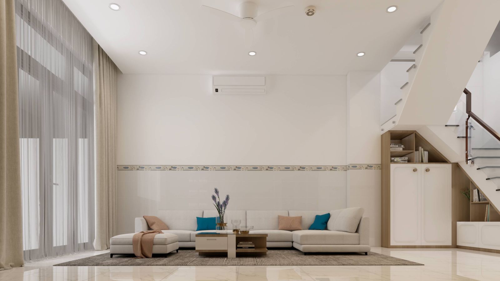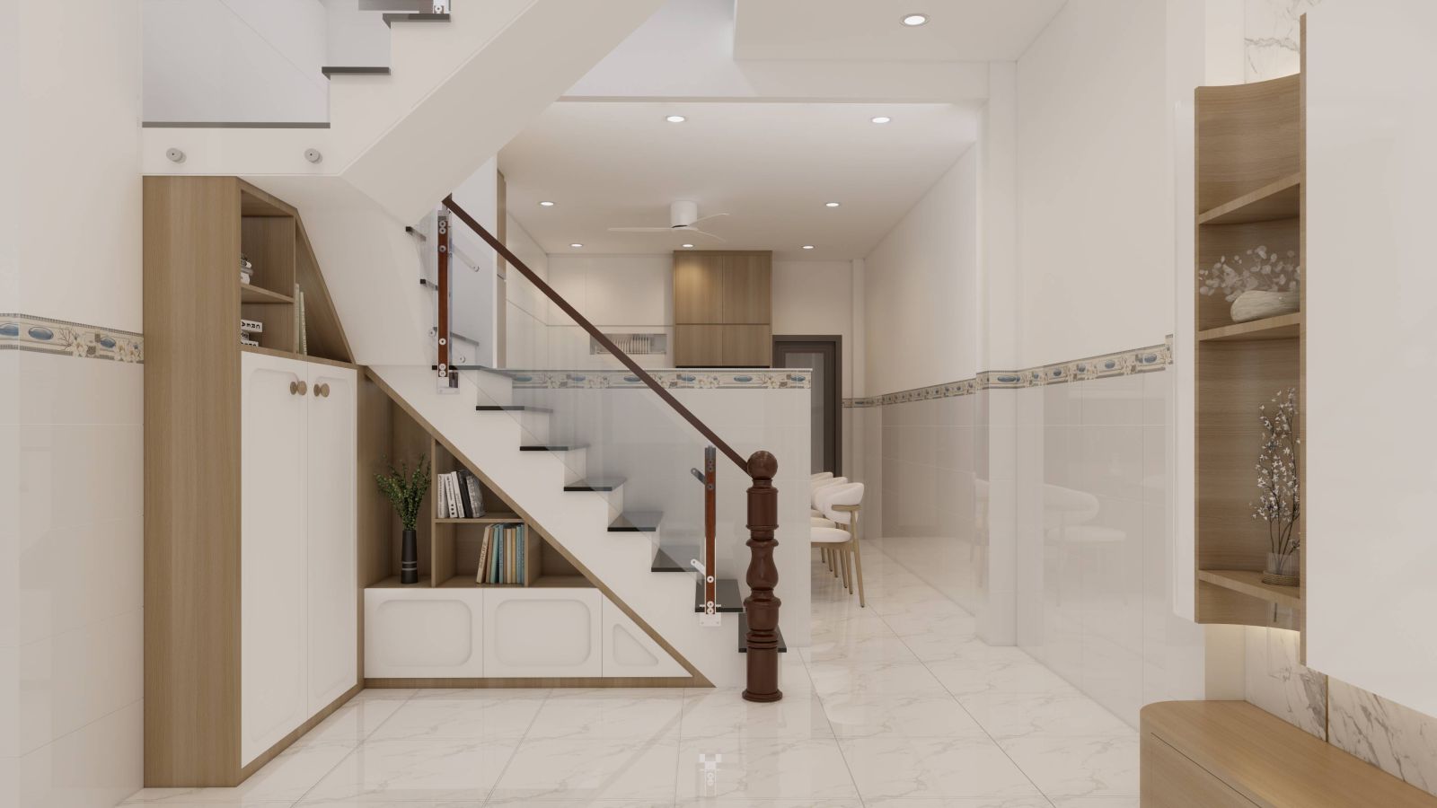 Khoảng trống dưới chân cầu thang được tận dụng làm hệ tủ gỗ, vừa tăng diện tích chứa đồ, vừa tạo sự liền mạch cho tổng thể nội thất. Đây là điểm nhỏ nhưng thể hiện rõ tư duy thiết kế tối ưu không gian đặc trưng của nhà phố.