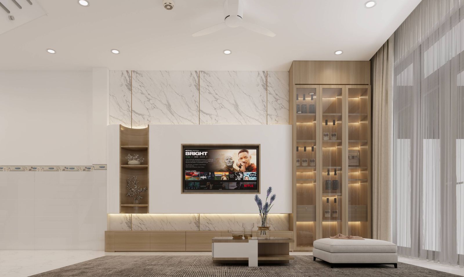 Phòng khách nổi bật với hệ kệ tivi và tủ trang trí bằng gỗ, thiết kế liền mạch, đường nét đơn giản nhưng tinh tế. Không gian được tận dụng ánh sáng tự nhiên, tạo cảm giác rộng rãi và dễ chịu khi sử dụng hằng ngày.