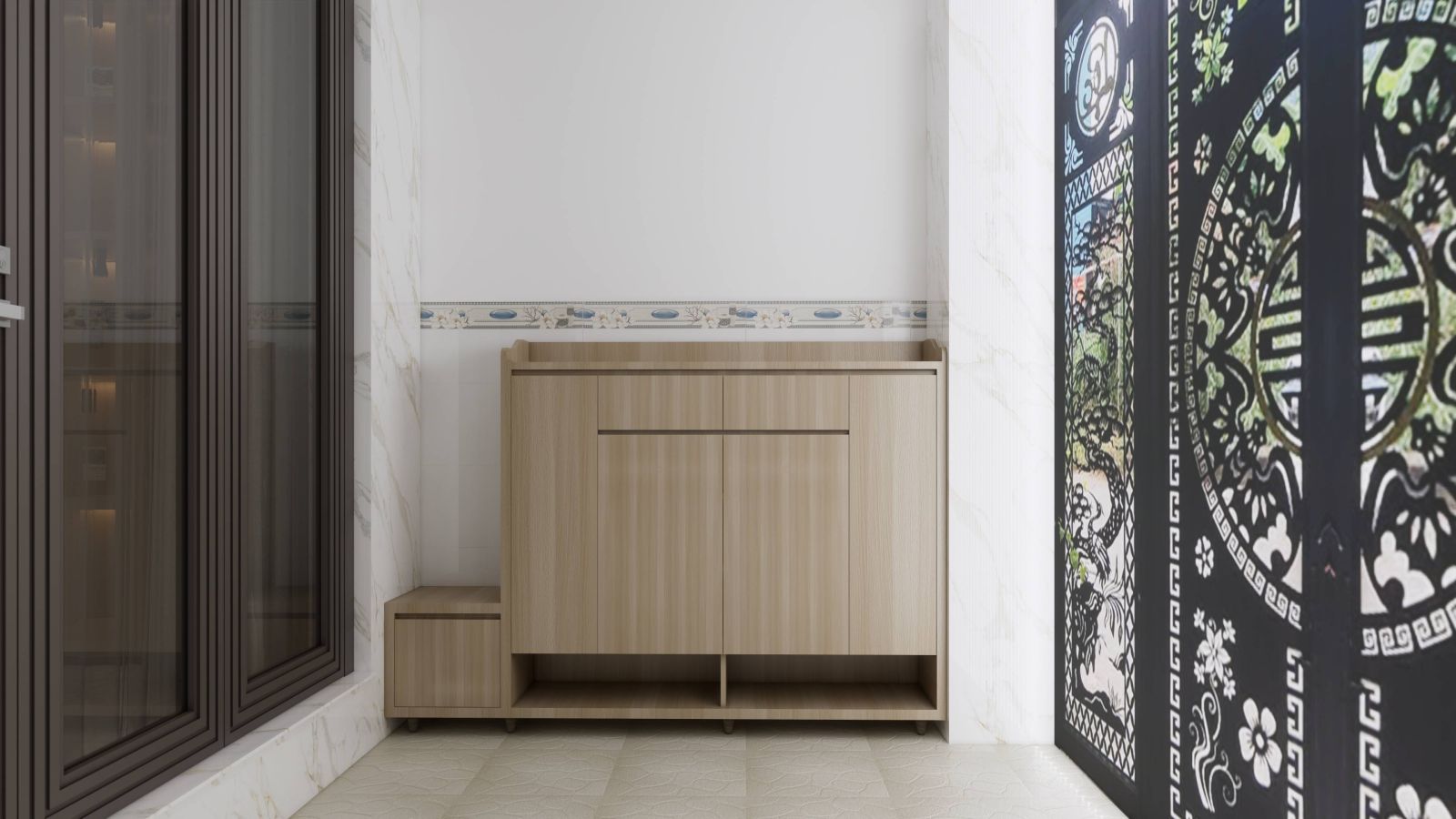 Tủ giày được bố trí ngay khu vực cửa ra vào, thiết kế gọn, bằng gỗ, đồng bộ với nội thất bên trong. Cách bố trí này giúp nhà luôn ngăn nắp, sạch sẽ ngay từ bước đầu tiên khi về nhà.