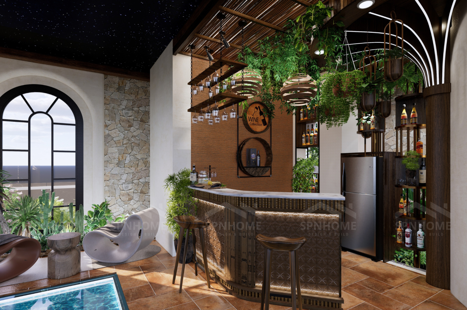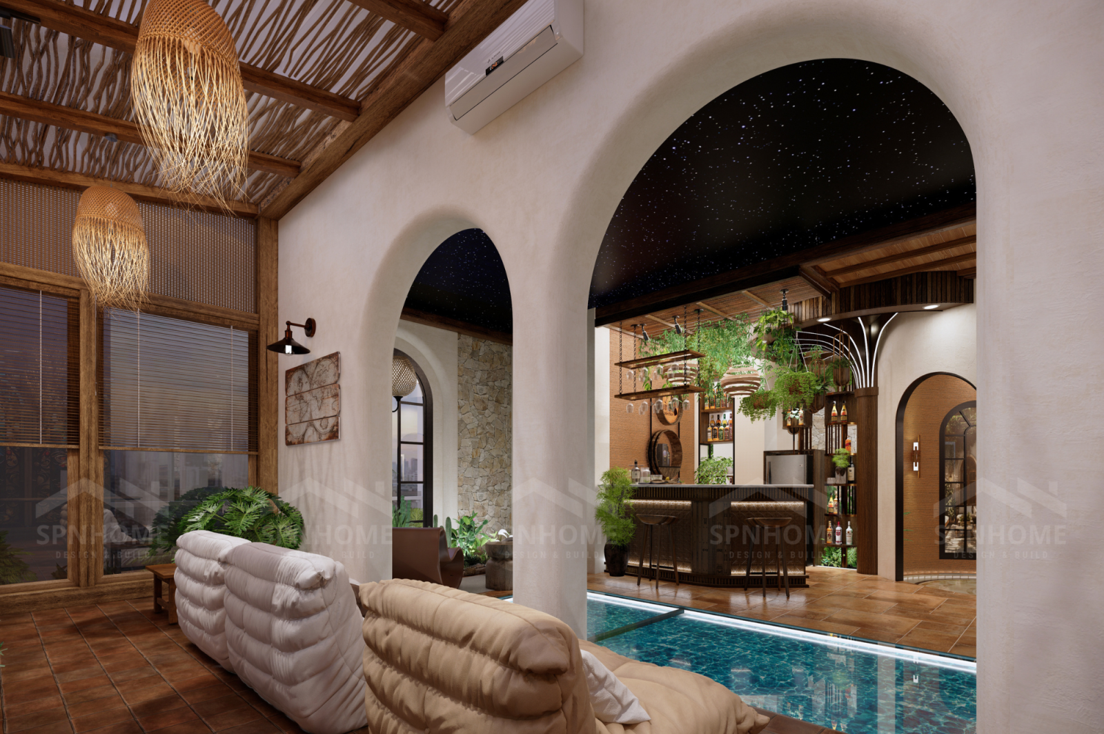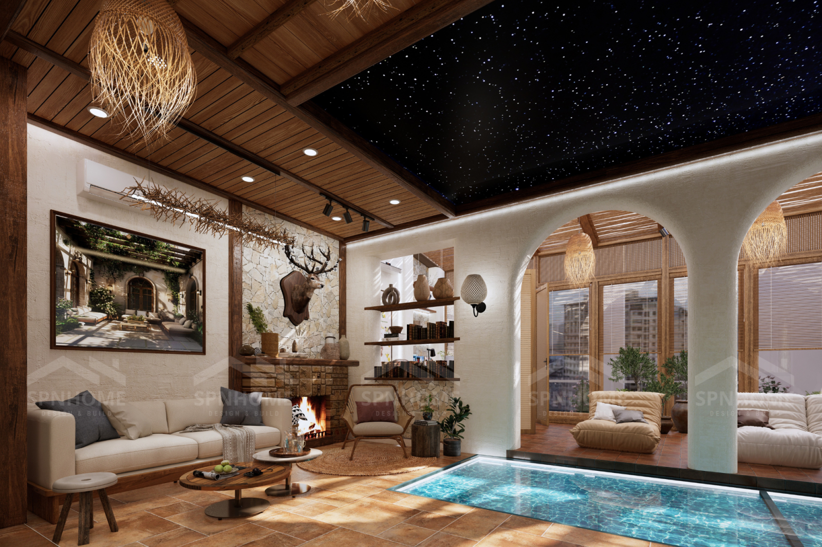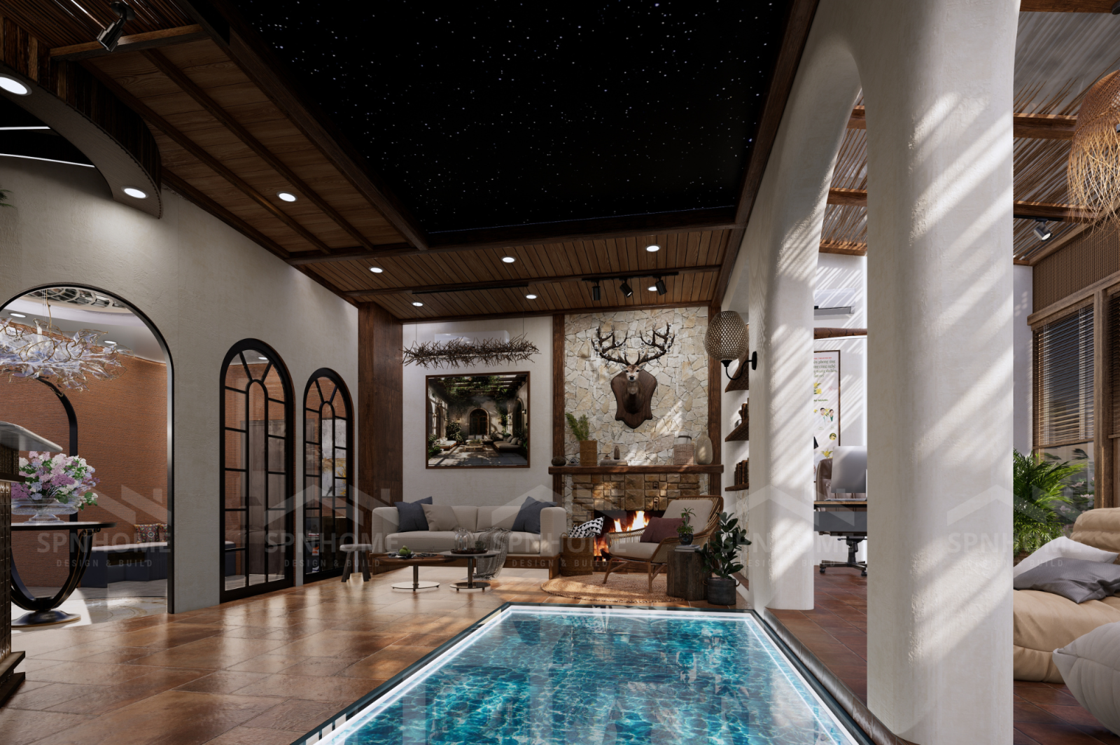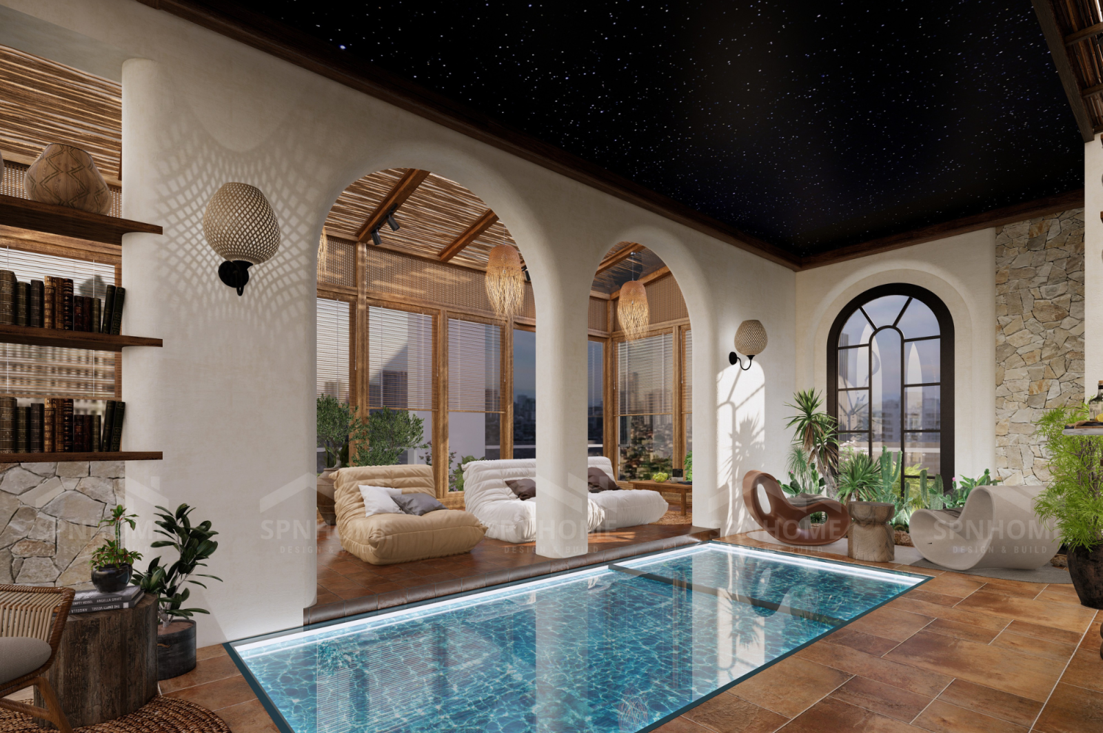 Có lẽ đây là nơi khiến nhiều người nhầm tưởng đây là một villa hay một resort. Không gian được “bẻ cong” khỏi những giới hạn thông thường: một hồ bơi giả mang lại cảm giác như đang ở ngoài trời, bên cạnh là khu bar và lounge ấm cúng, tạo nên một điểm hẹn lý tưởng cho những buổi gặp gỡ, thư giãn hay đơn giản chỉ để tận hưởng chính mình.