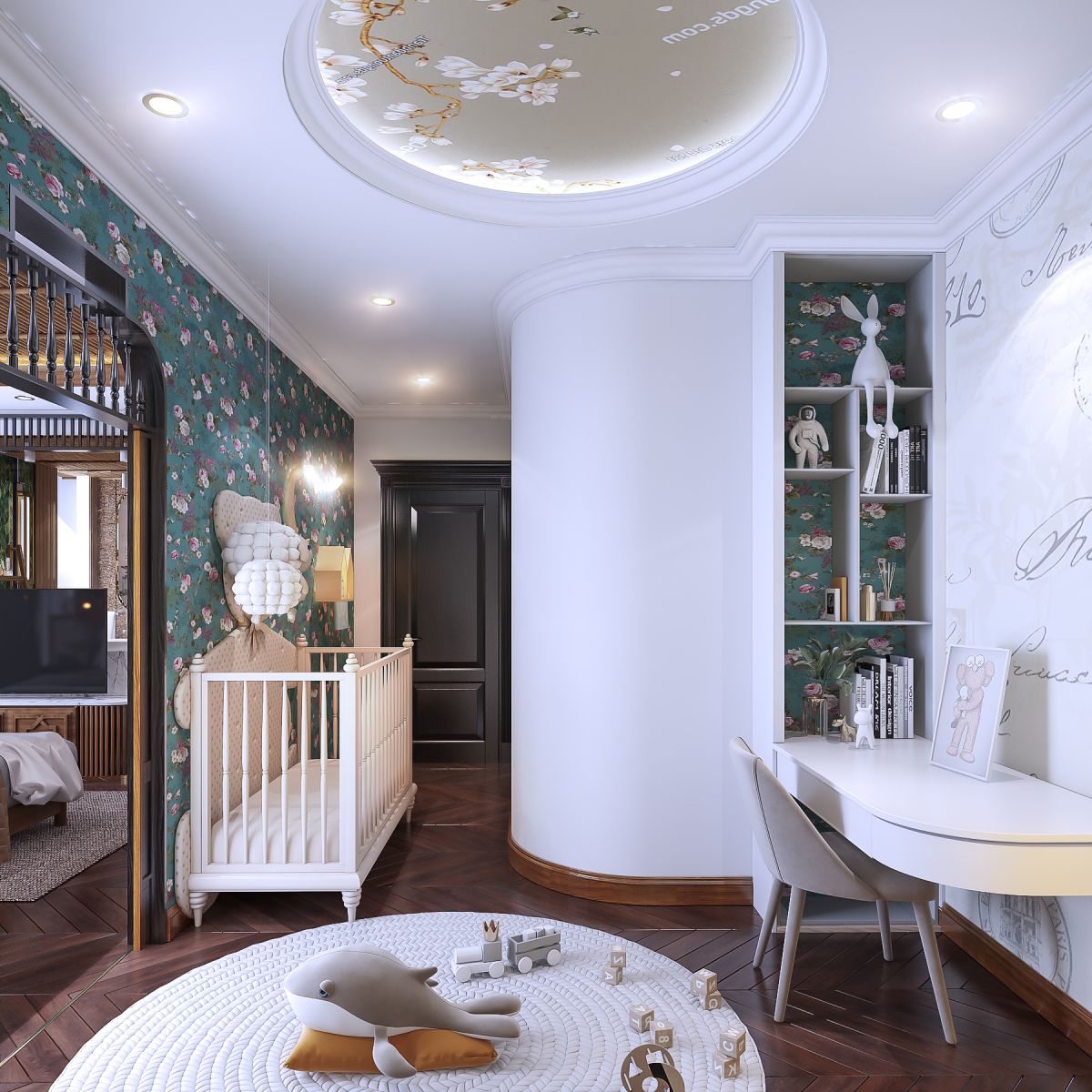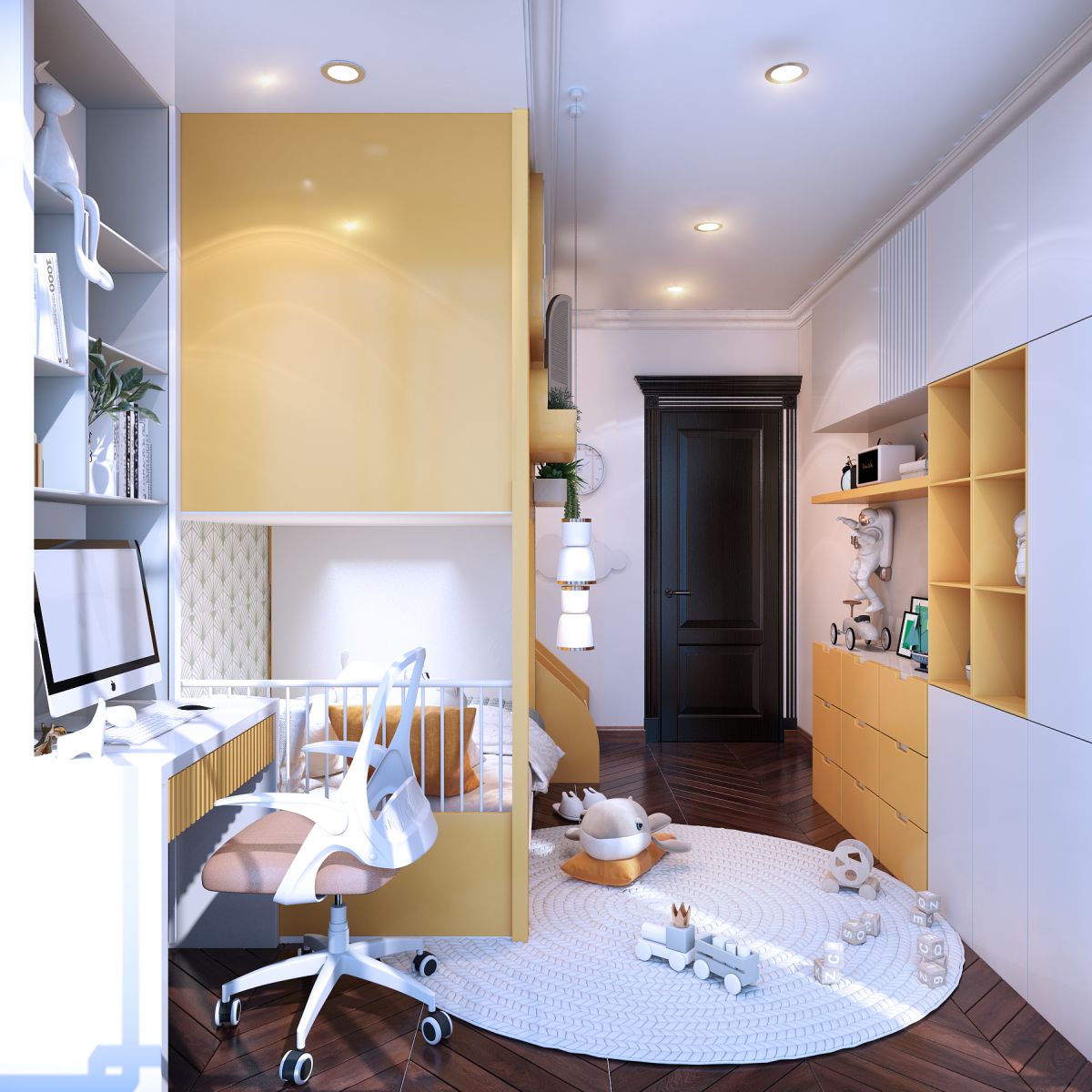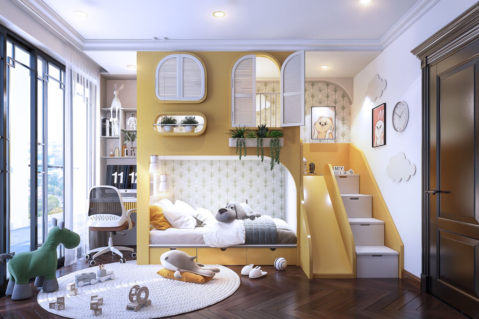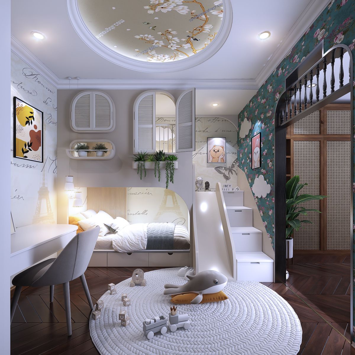 Không gian dành cho con được thiết kế như một thế giới nhỏ – nơi trí tưởng tượng có thể bay xa, và cảm giác an toàn luôn hiện hữu. Giường tầng tích hợp cầu trượt, góc học tập ngập sáng bên khung cửa lớn, từng chi tiết đều được tính toán để khơi gợi sự tò mò mà vẫn nhẹ nhàng, gọn gàng và tinh tế.