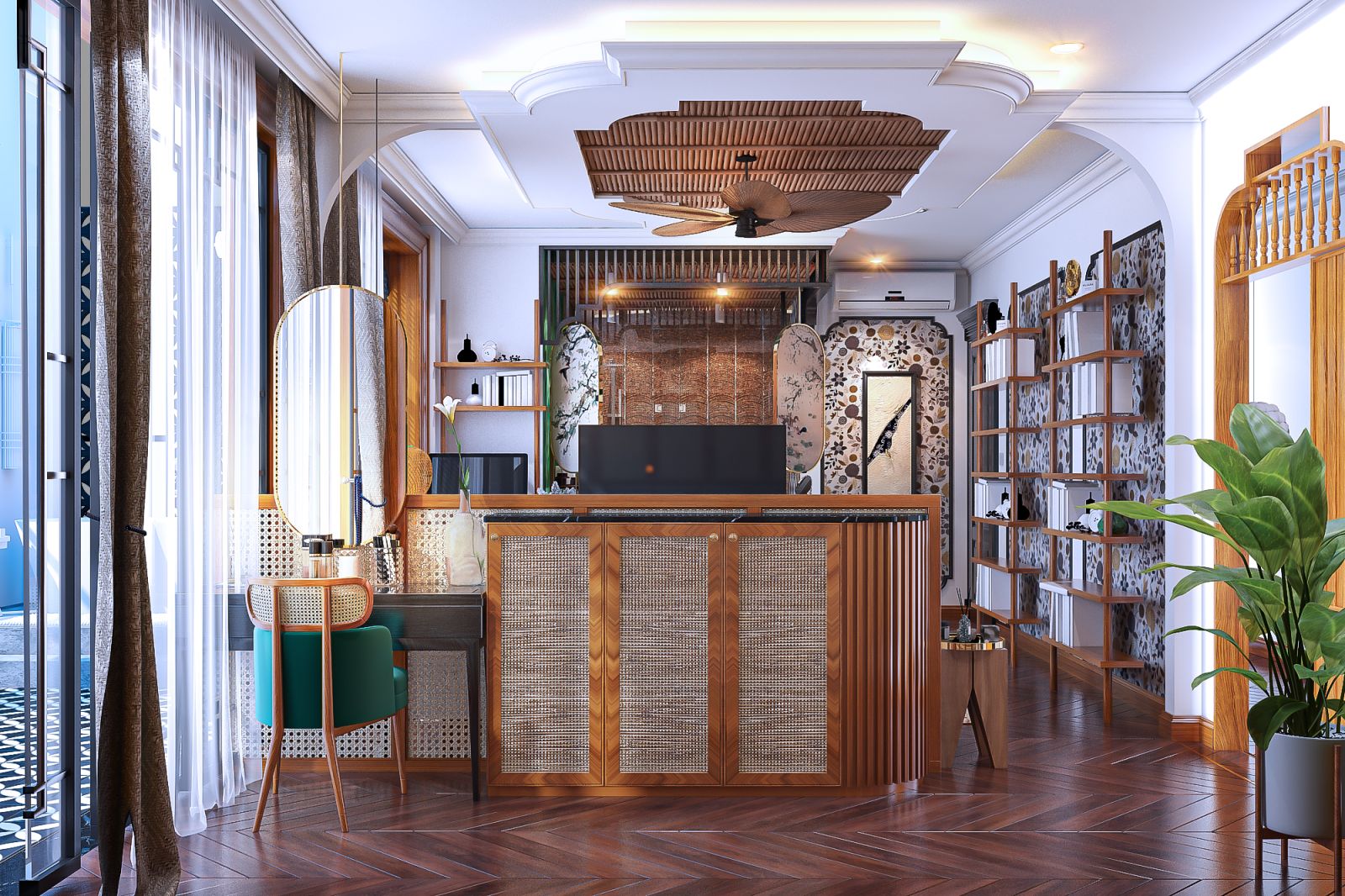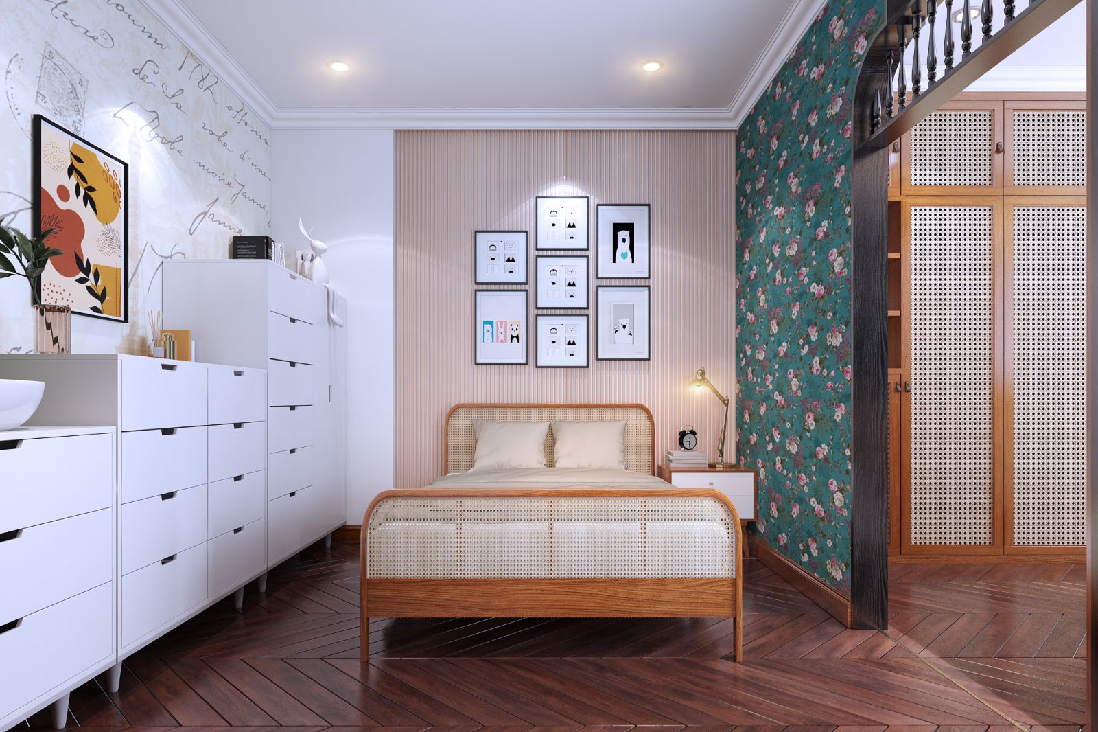 Từng chi tiết như gỗ tối màu, phào chỉ mềm mại, hoa văn gạch, tay nắm đồng, mây tre đan… được kết hợp cùng các mảng tường ốp đá và ánh sáng tự nhiên để tạo nên một tổng thể hài hòa, vừa phảng phất nét xưa, vừa phù hợp với gu sống đương đại của đôi vợ chồng trẻ.