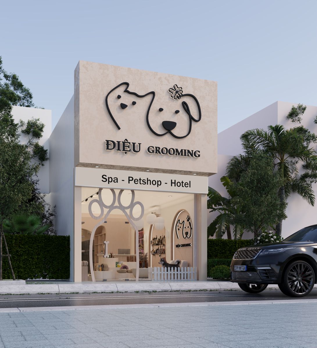 Không gian diện tích 99m² với bài toán đặt ra là: tổ chức ba chức năng vận hành gồm spa, cửa hàng và khách sạn thú cưng trong một không gian có tính nhận diện, vận hành linh hoạt và thẩm mỹ ổn định theo thời gian.