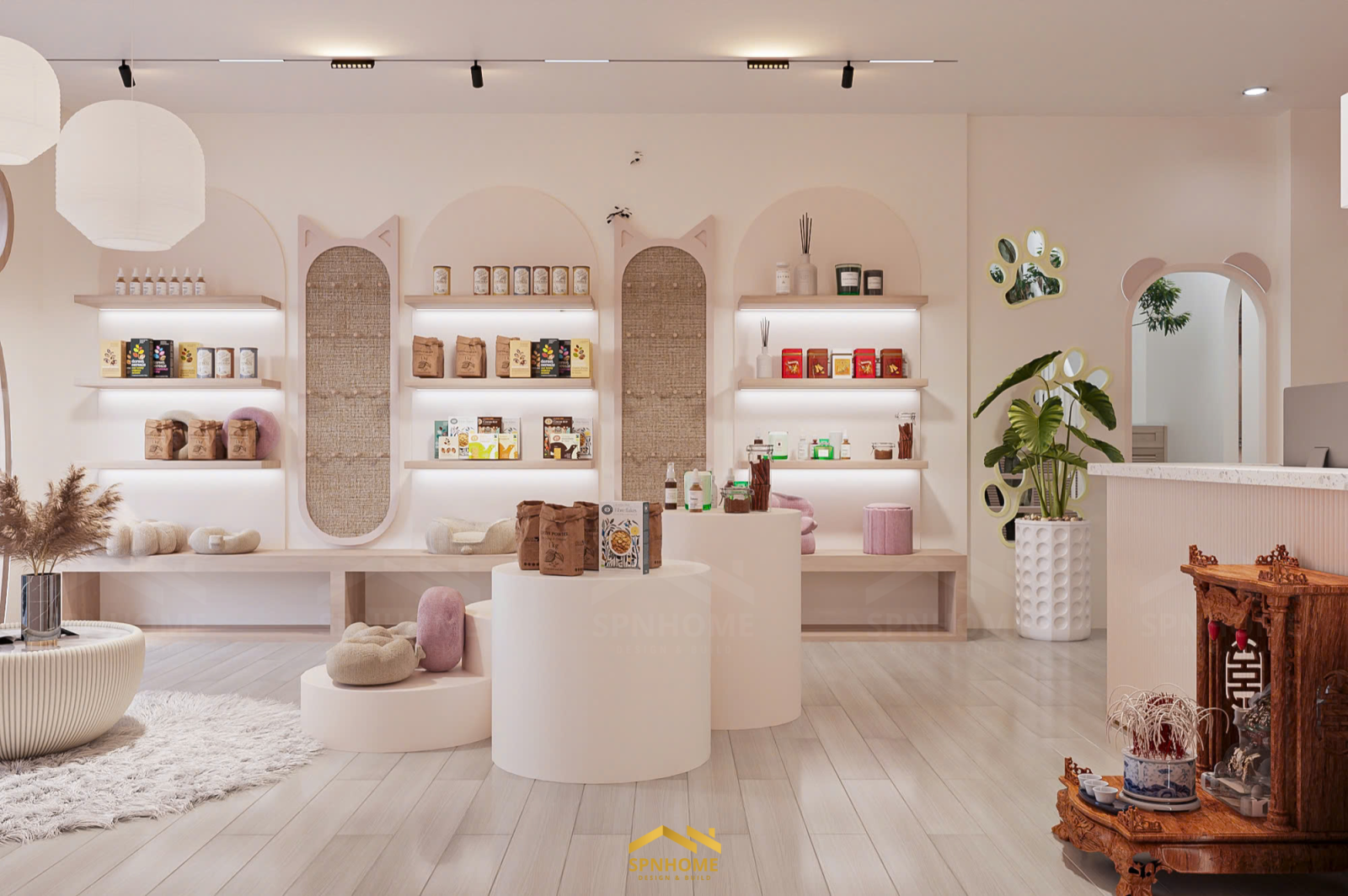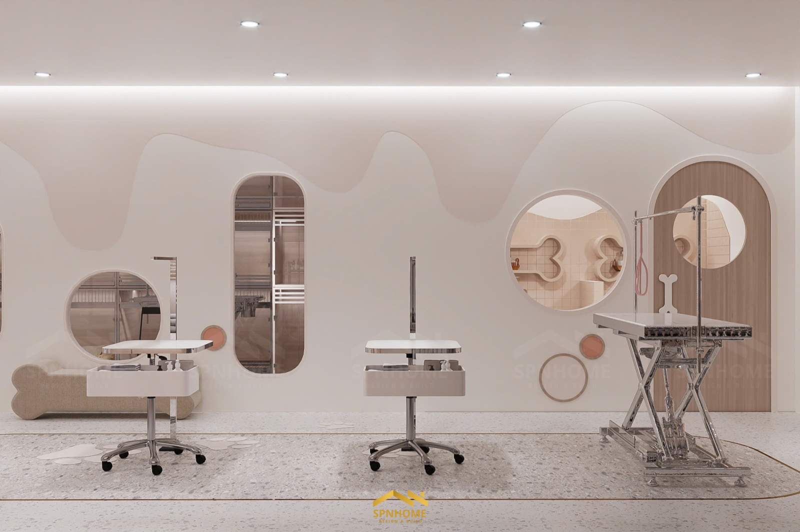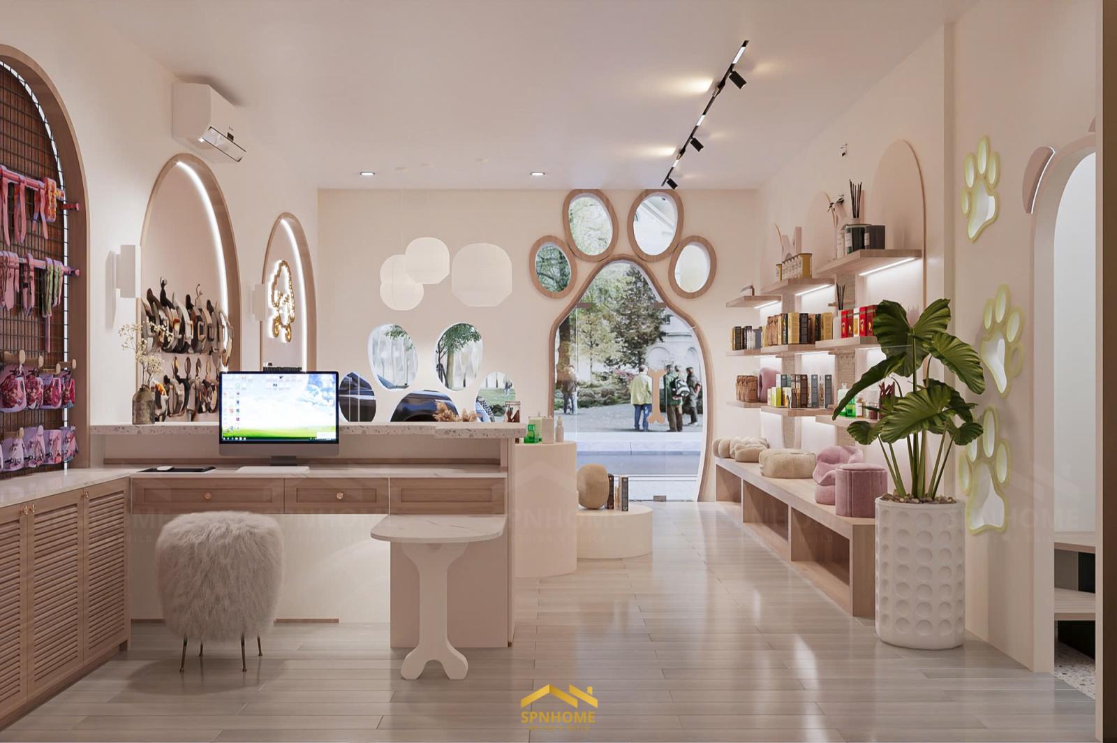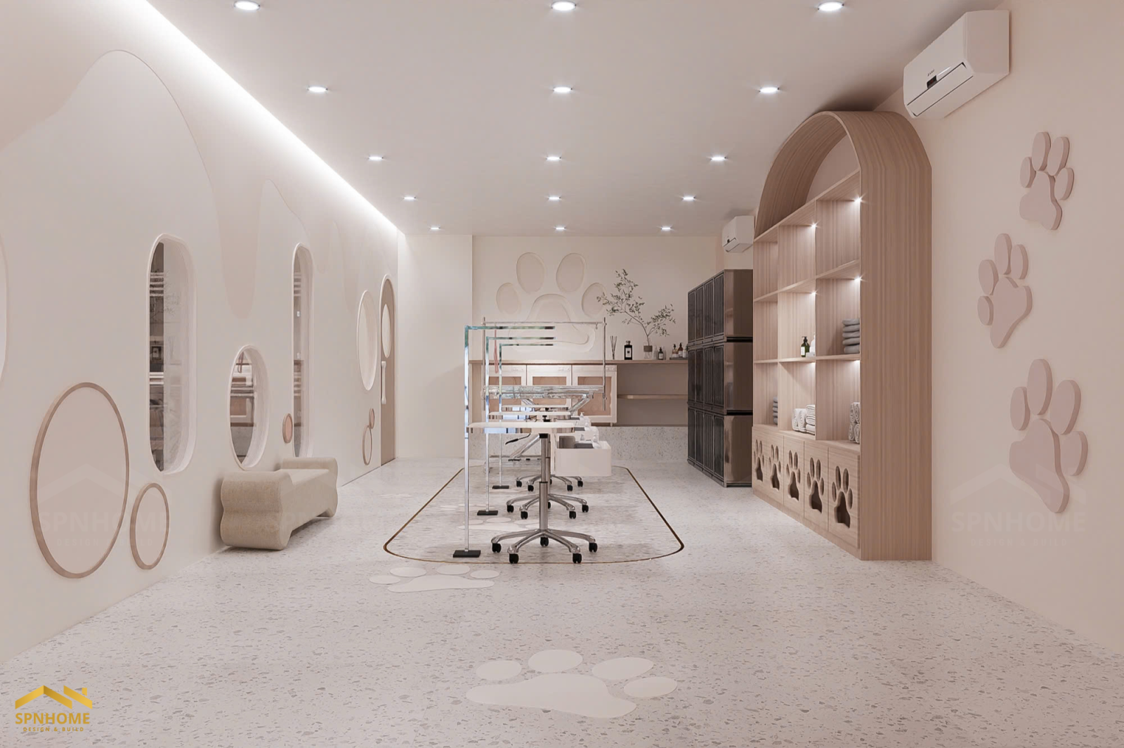 Công trình Petshop tích hợp ba chức năng chính: spa – cửa hàng – khách sạn thú cưng. Mỗi khu có vai trò riêng, nhưng không hoạt động tách biệt. Thiết kế của SPNhome cũng không nằm ở việc chia bao nhiêu diện tích cho mỗi chức năng, mà là làm thế nào để mọi thứ vận hành liên tục và tự nhiên nhất có thể.