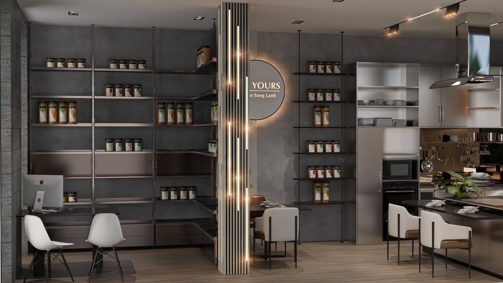 Khu vực coffee và bếp mở được thiết kế liền mạch với showroom: