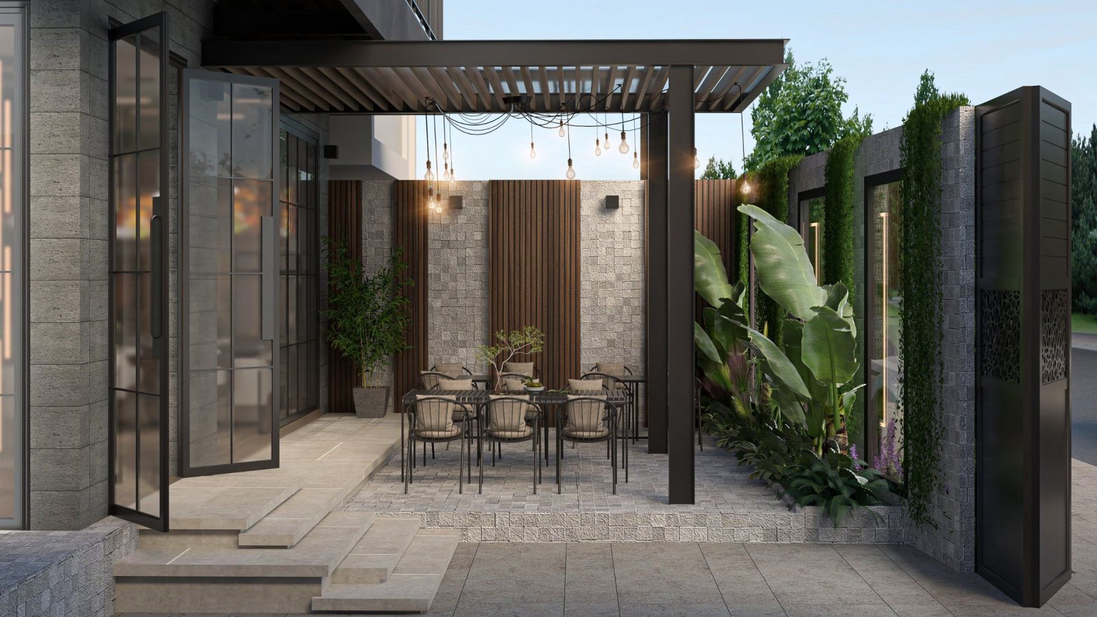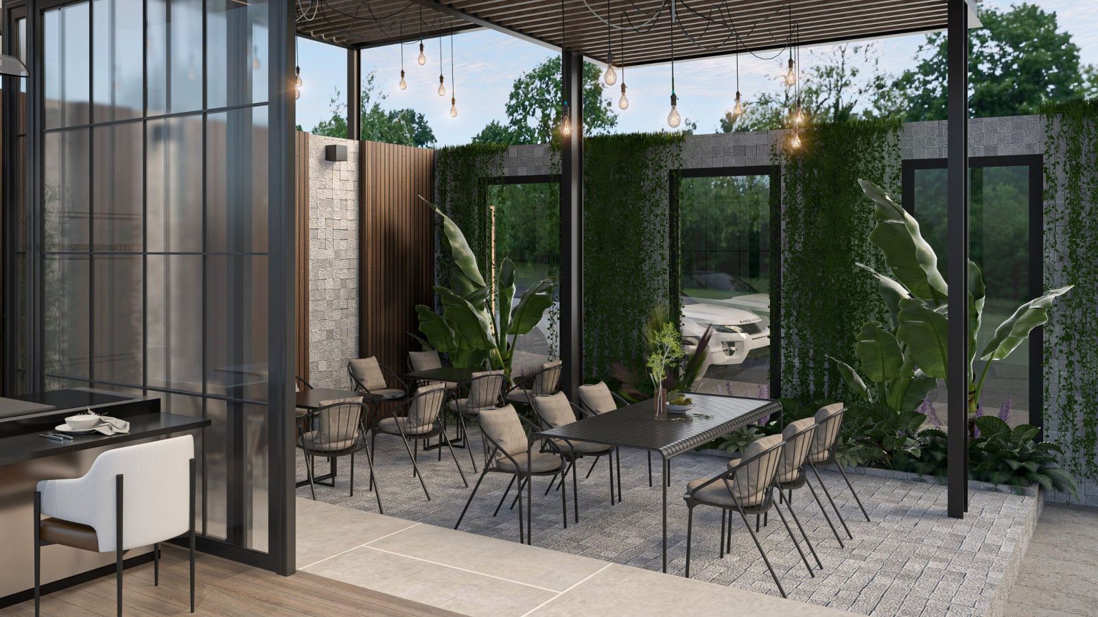 Khu vực ngoài trời với bàn ghế, cây xanh và vách ngăn phủ thảm thực vật là không gian lý tưởng cho những buổi gặp gỡ khách hàng hoặc thảo luận nhóm.
