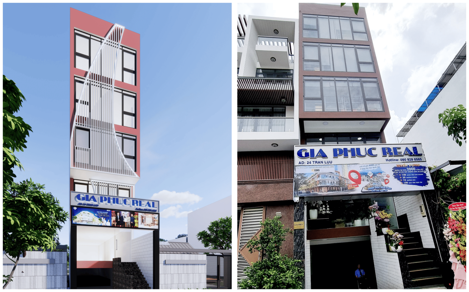 Công trình nổi bật với kiến trúc hiện đại, đường nét vuông vức, gam màu đỏ – xám mạnh mẽ kết hợp mảng kính lớn giúp tôn lên hình khối công trình.