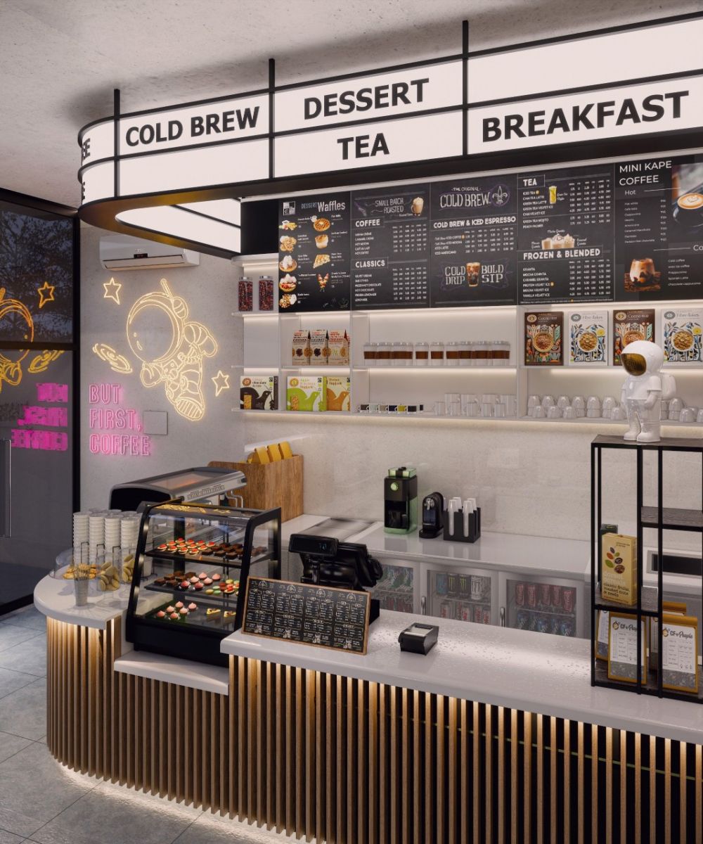 Không gian ngồi được bố trí linh hoạt: ghế cao sát cửa kính để ngắm nhìn phố phường, bàn tròn nhỏ cho những buổi trò chuyện nhanh. Các chi tiết trang trí trẻ trung như hình astronaut bay bổng tạo thêm cảm giác vui tươi, khơi gợi tinh thần sáng tạo ngay từ những phút đầu ngày.