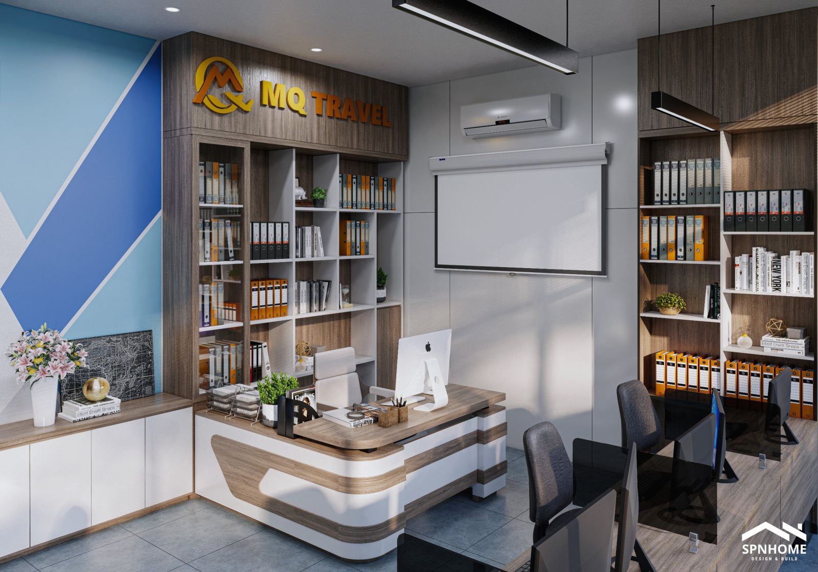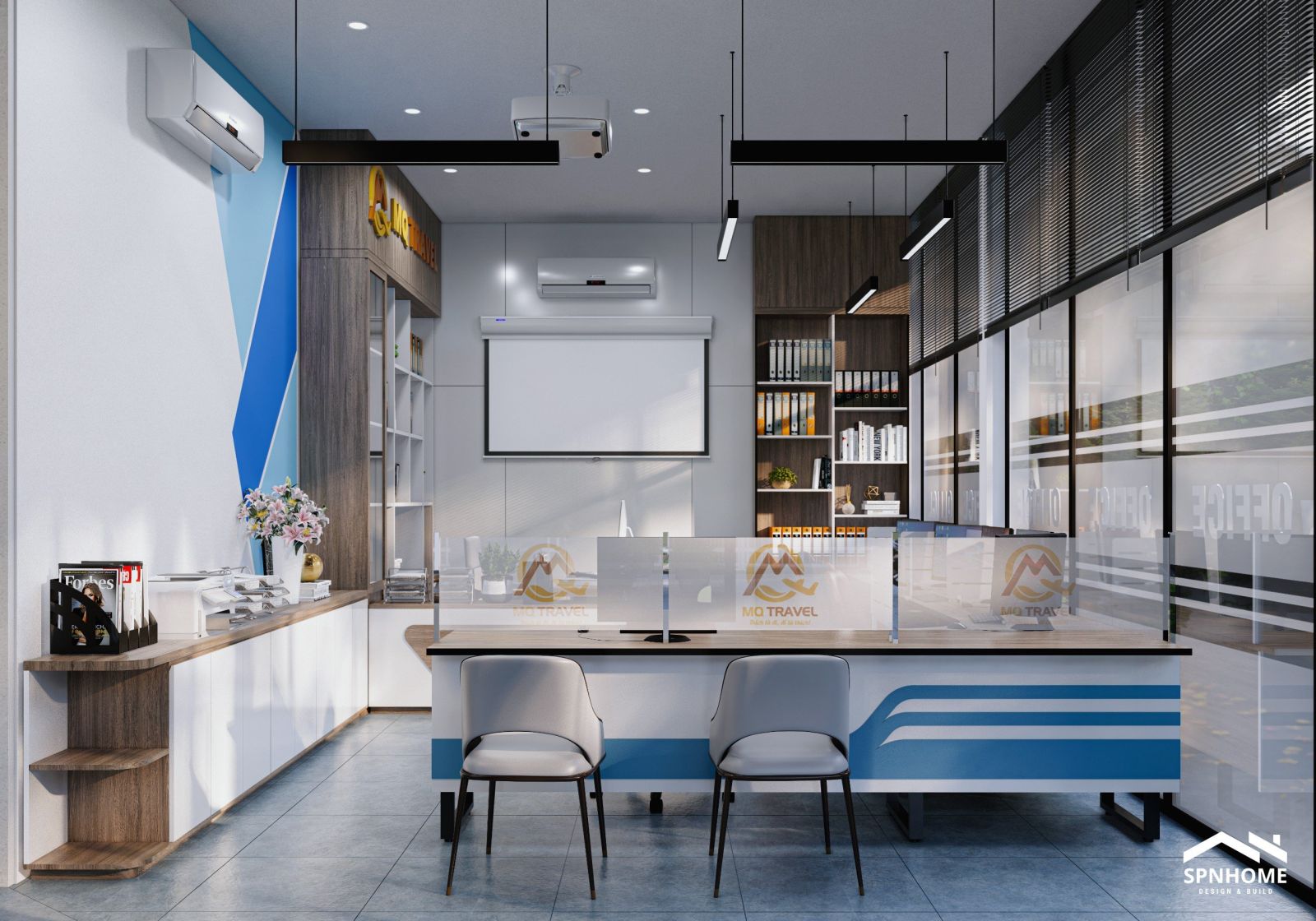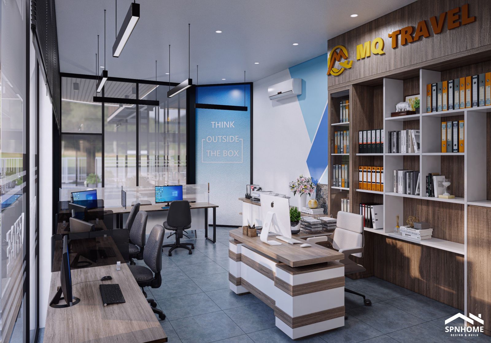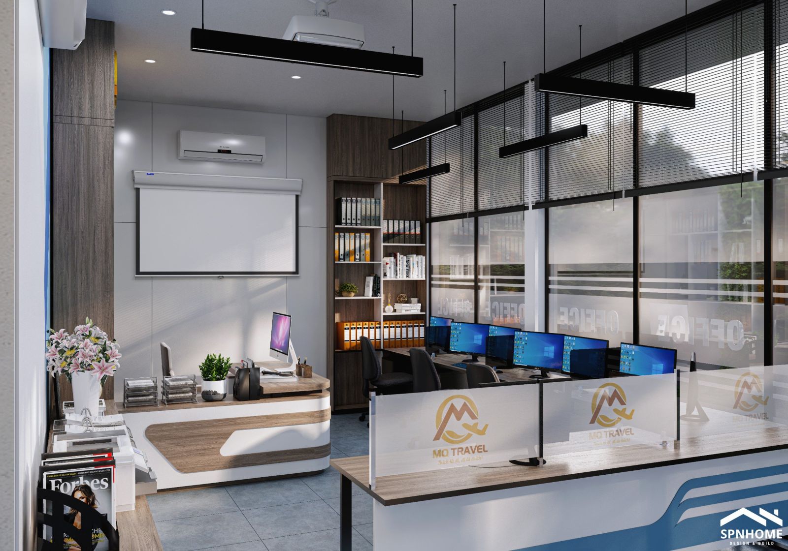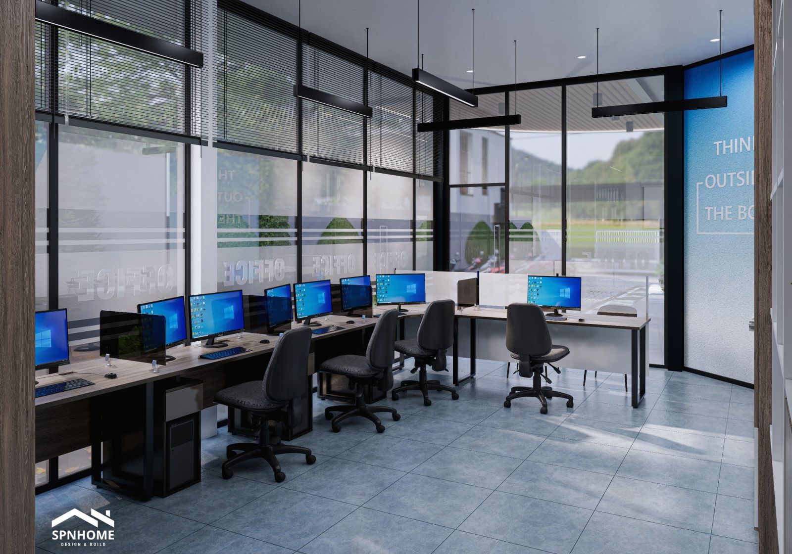 Khu vực làm việc được bố trí dạng mở, bàn dài kết hợp vách kính trong suốt tạo sự riêng tư mà vẫn giữ sự gắn kết. Bàn giám đốc riêng biệt, phòng họp với bảng kính và máy chiếu, cùng những câu slogan truyền cảm hứng trên tường – tất cả tạo nên một môi trường làm việc vừa hiện đại, vừa khuyến khích sáng tạo.