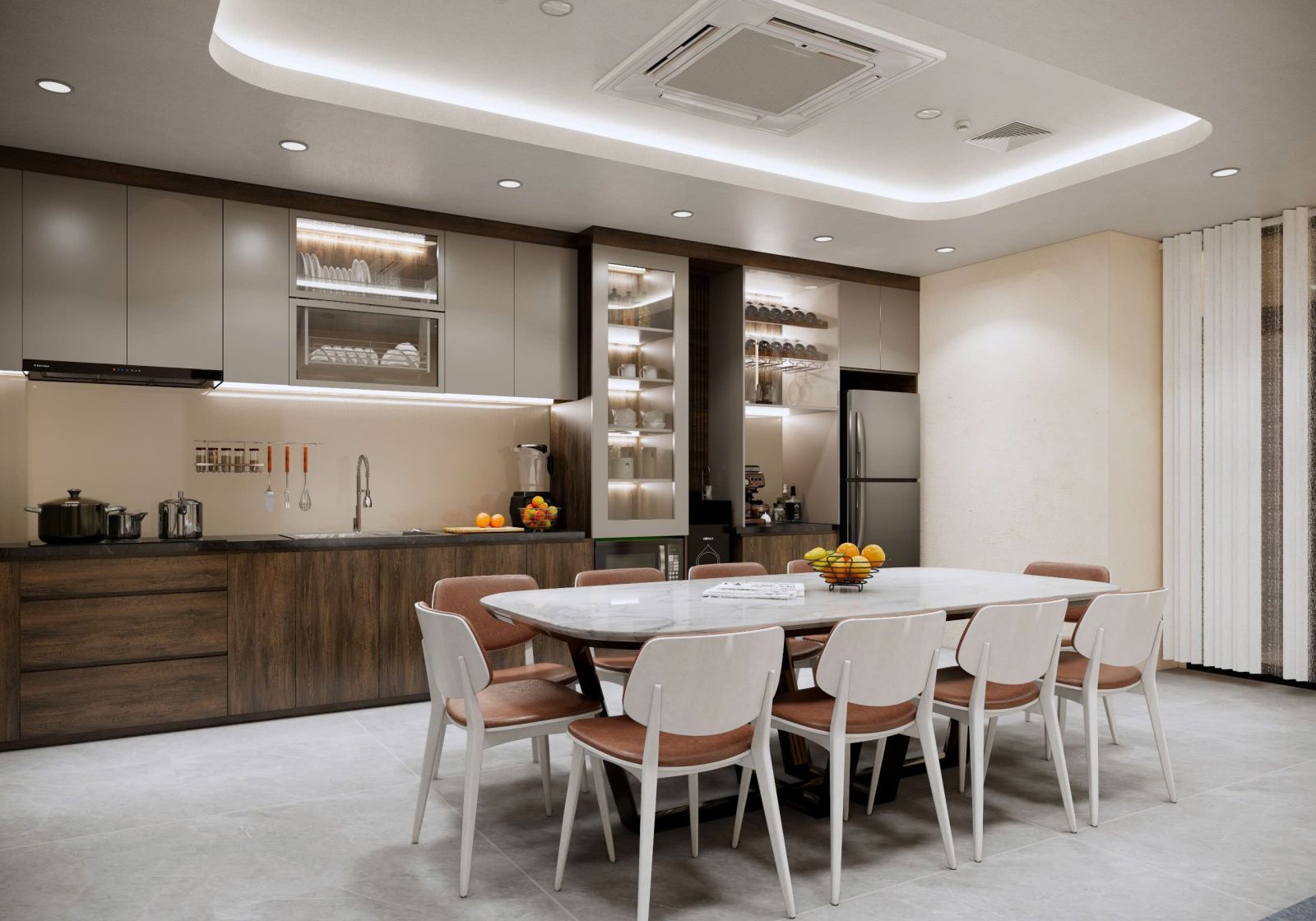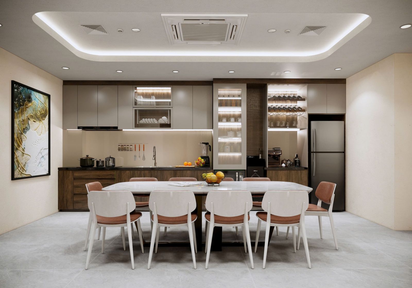 Căn tin & bếp ăn: Không chỉ đơn thuần là nơi dùng bữa, khu vực căn tin được thiết kế như một phòng sinh hoạt chung, ấm cúng và tiện nghi. Với bàn ăn dài, bếp đầy đủ trang thiết bị, đây là chỗ để mọi người cùng nhau thưởng thức bữa ăn, chia sẻ câu chuyện và gắn kết tinh thần đồng đội.