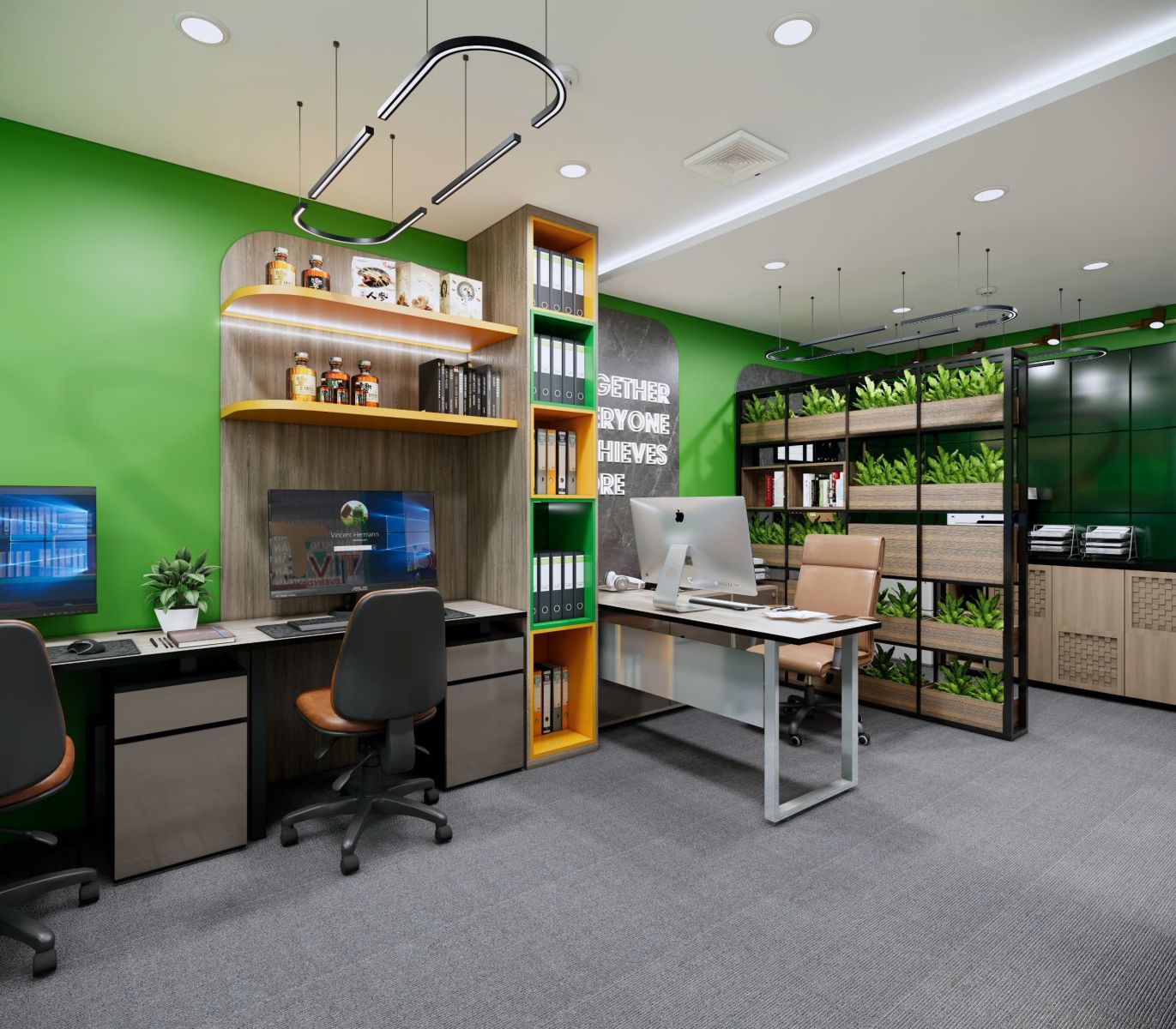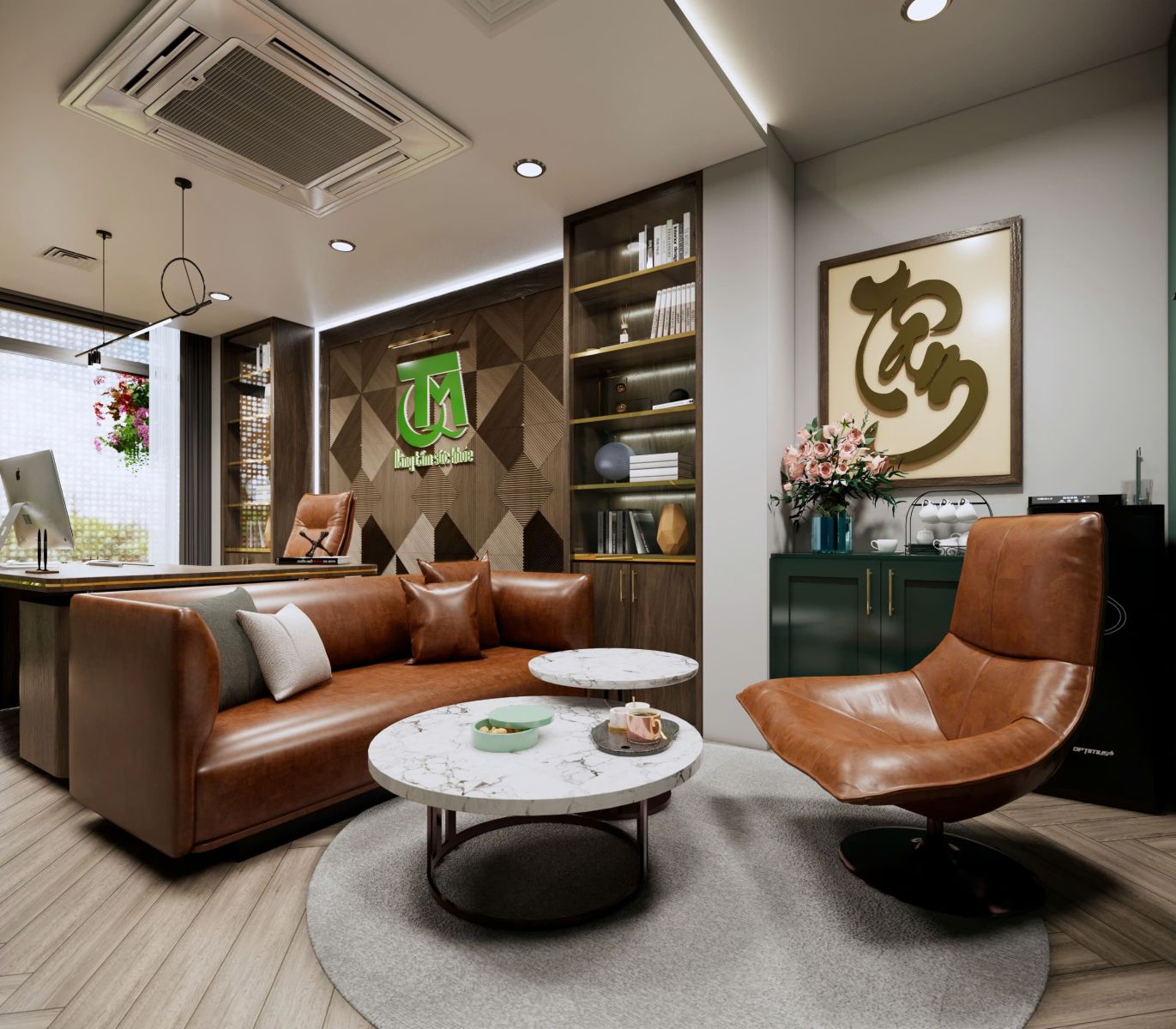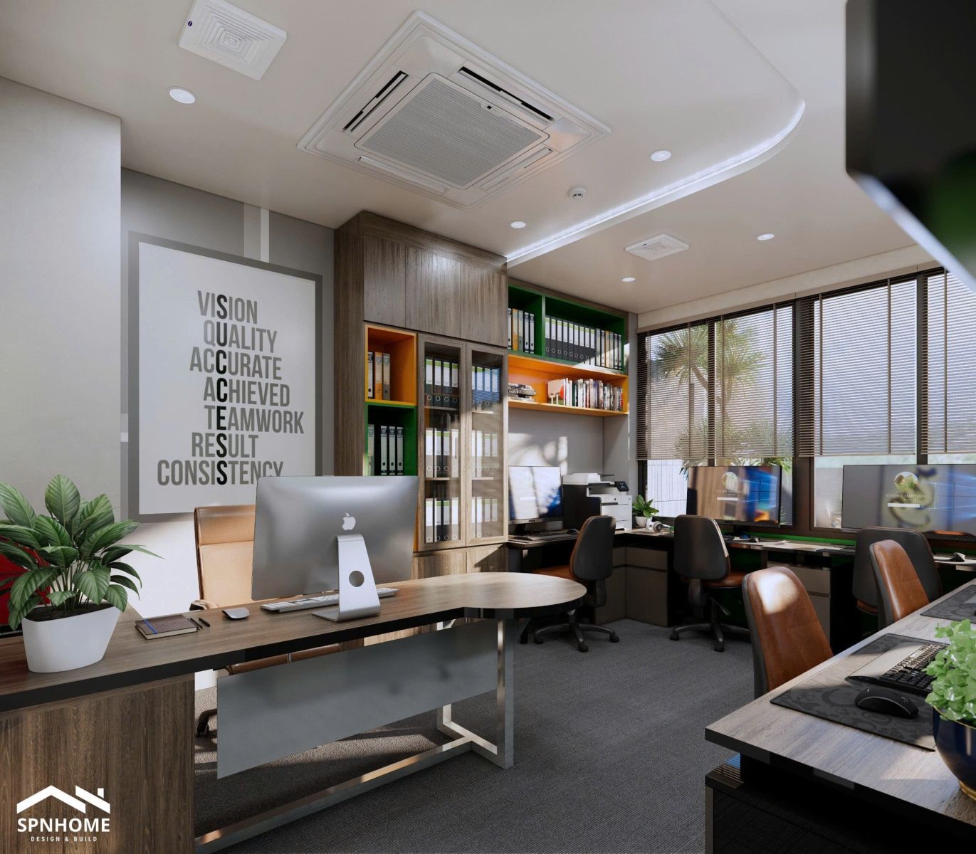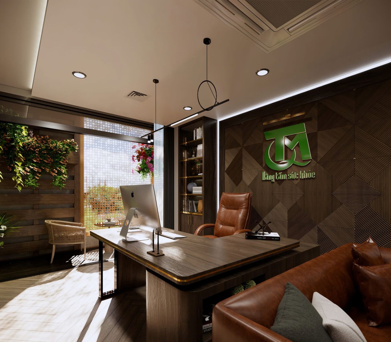 Phòng Giám đốc: Không gian sang trọng với nội thất gỗ chủ đạo, điểm xuyết mảng xanh và ban công thoáng đãng có ghế mây thư giãn. Đây là nơi kết nối tầm nhìn lãnh đạo với sự gần gũi, cởi mở.