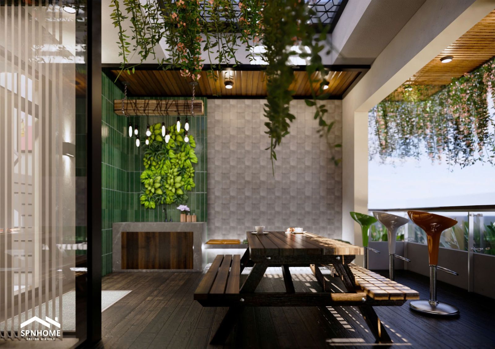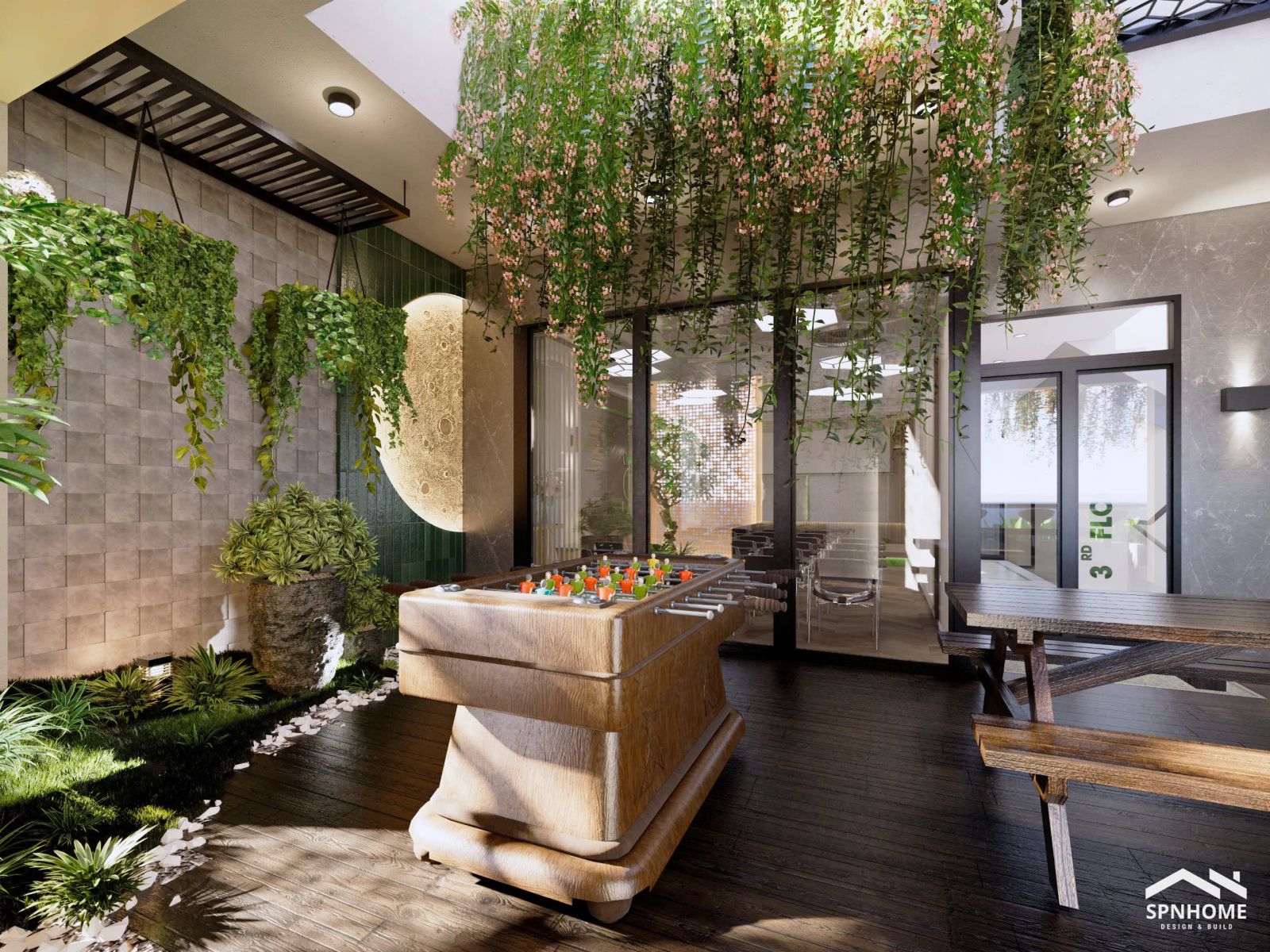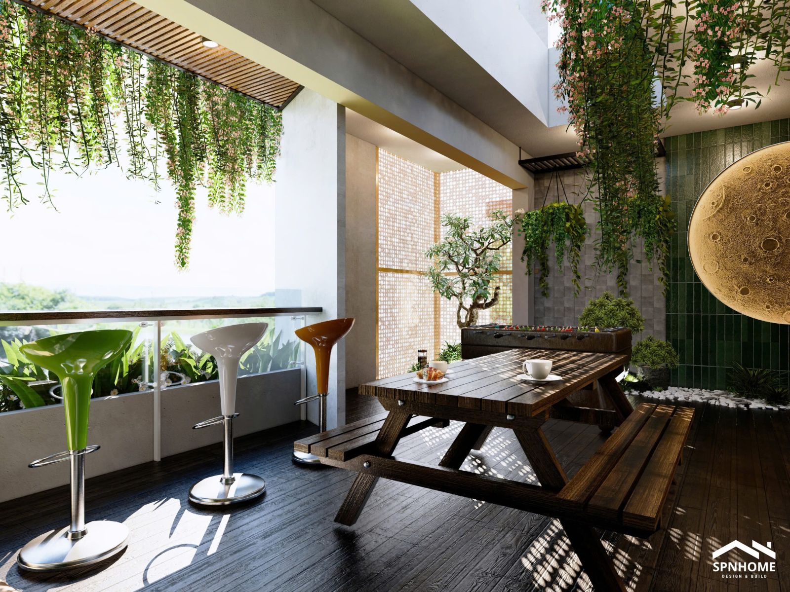 Ban công & sân vườn: Một không gian mở, xanh mát với cây cối và ánh sáng tự nhiên tràn ngập. Những bộ bàn ghế gỗ, ghế bar hiện đại cùng bàn bi lắc tạo cảm giác vừa như một quán café sân vườn, vừa là khu vui chơi nhỏ – giúp nhân viên thư giãn, nạp lại năng lượng sau những giờ làm việc căng thẳng.