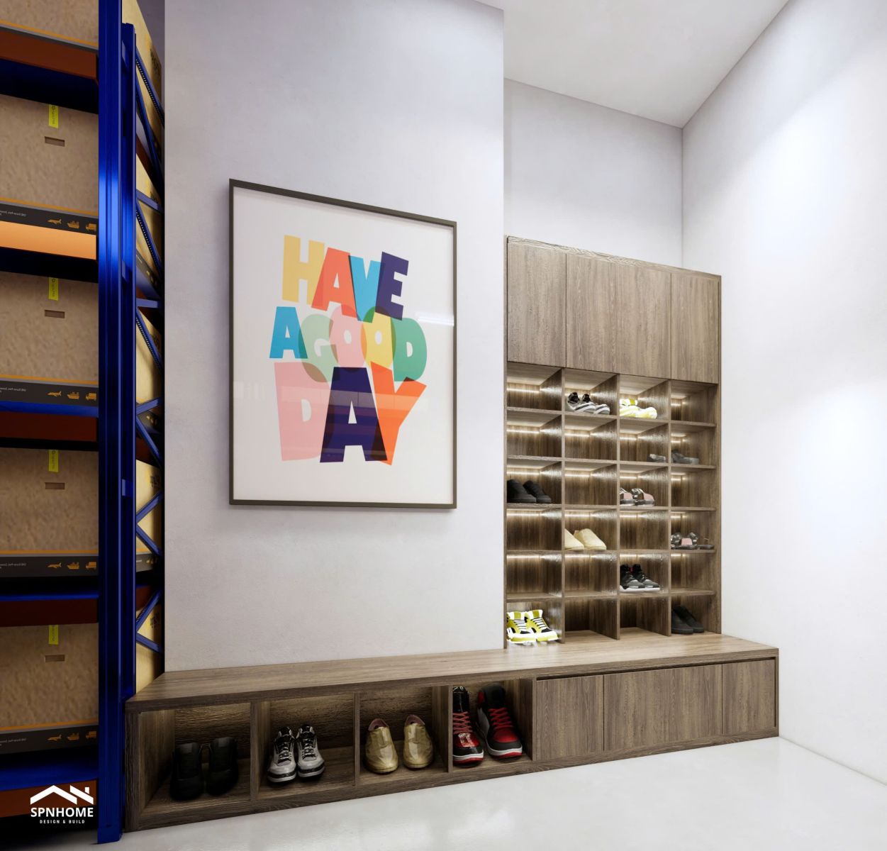 Không gian tiện ích: Tủ giày dép, khu vực vệ sinh và lối đi được bố trí hợp lý, mang đến sự thoải mái và giữ cho môi trường làm việc luôn gọn gàng.